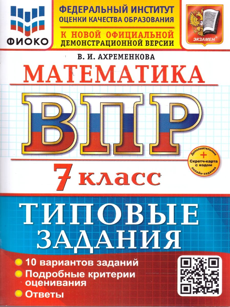 МАТЕМАТИКА. ВСЕРОССИЙСКАЯ ПРОВЕРОЧНАЯ РАБОТА. 7 КЛАСС. 10 ВАРИАНТОВ. ТИПОВЫЕ ЗАДАНИЯ. 10 вариантов заданий. Подробные критерии оценивания. Ответы. ФГОС НОВЫЙ.| Издательство | Издательство «Экзамен» |