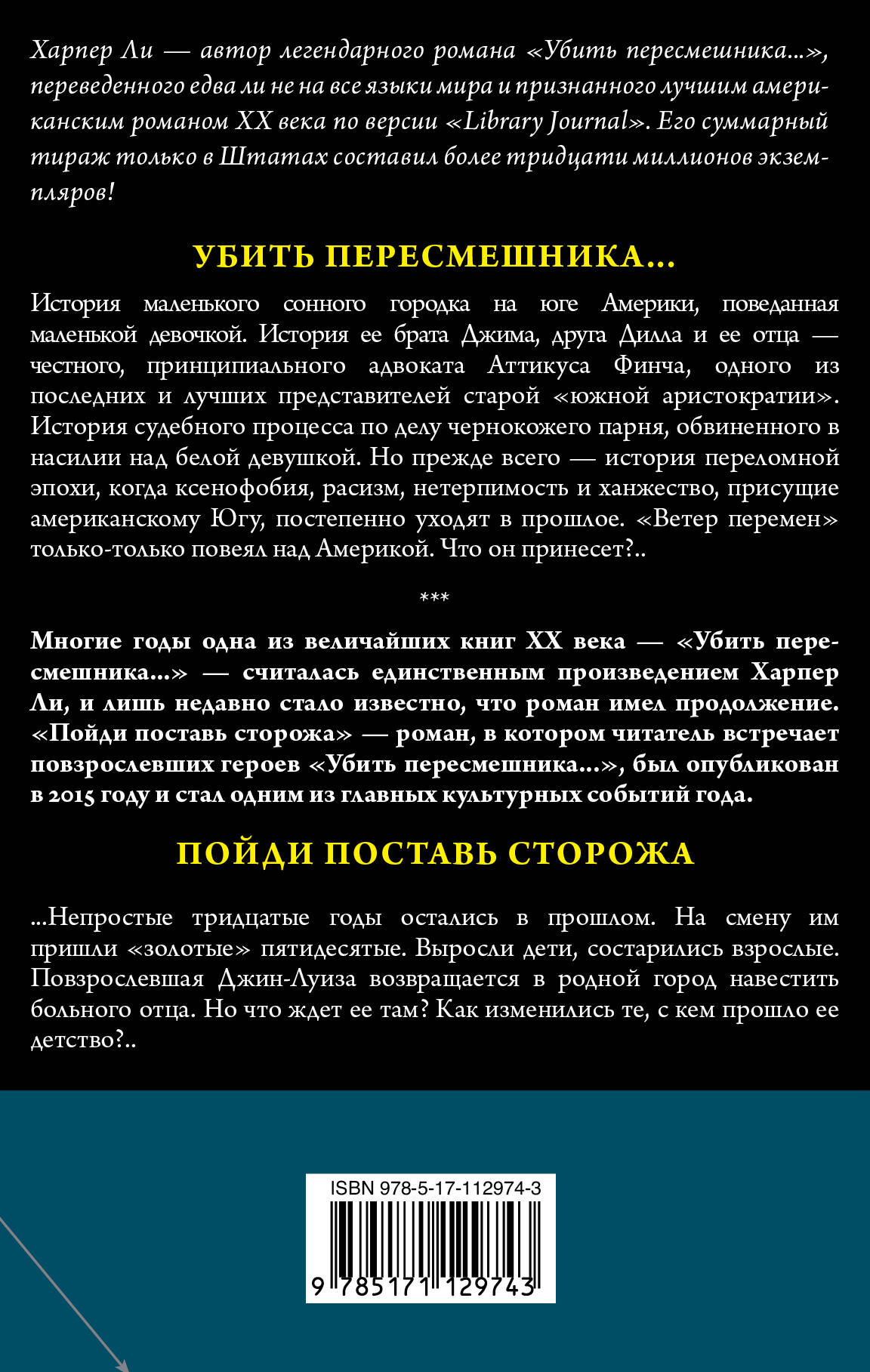 УБИТЬ ПЕРЕСМЕШНИКА... История маленького сонного городка на юге Америки, поведанная маленькой девочкой. История ее брата Джима, друга Дилла и ее отца - честного, принципиального адвоката Аттикуса Финча, одного из последних и лучших представителей старой "южной аристократии". История судебного процесса по делу чернокожего парня, обвиненного в насилии над белой девушкой. Но прежде всего - история пере- ломной эпохи, когда ксенофобия, расизм, нетерпимость и ханжество, присущие американскому Югу, постепенно уходят в прошлое. "Ветер перемен" только-только повеял над Америкой. Что он принесет?.. *** Многие годы одна из величайших книг XX века - "Убить пере- смешника..." - считалась единственным произведением Харпер Ли, и лишь недавно стало известно, что роман имел продолжение. "Пойди поставь сторожа" - роман, в котором читатель встречает повзрослевших героев "Убить пересмешника...", был опубликован в 2015 году и стал одним из главных культурных событий года. ПОЙДИ ПОСТАВЬ СТОРОЖА ...Непростые тридцатые годы остались в прошлом. На смену им пришли "золотые" пятидесятые. Выросли дети, состарились взрослые. Повзрослевшая Джин-Луиза возвращается в родной город навестить больного отца. Но что ждет ее там? Как изменились те, с кем прошло ее детство?..| Издательство | ИЗДАТЕЛЬСТВО "АСТ" |