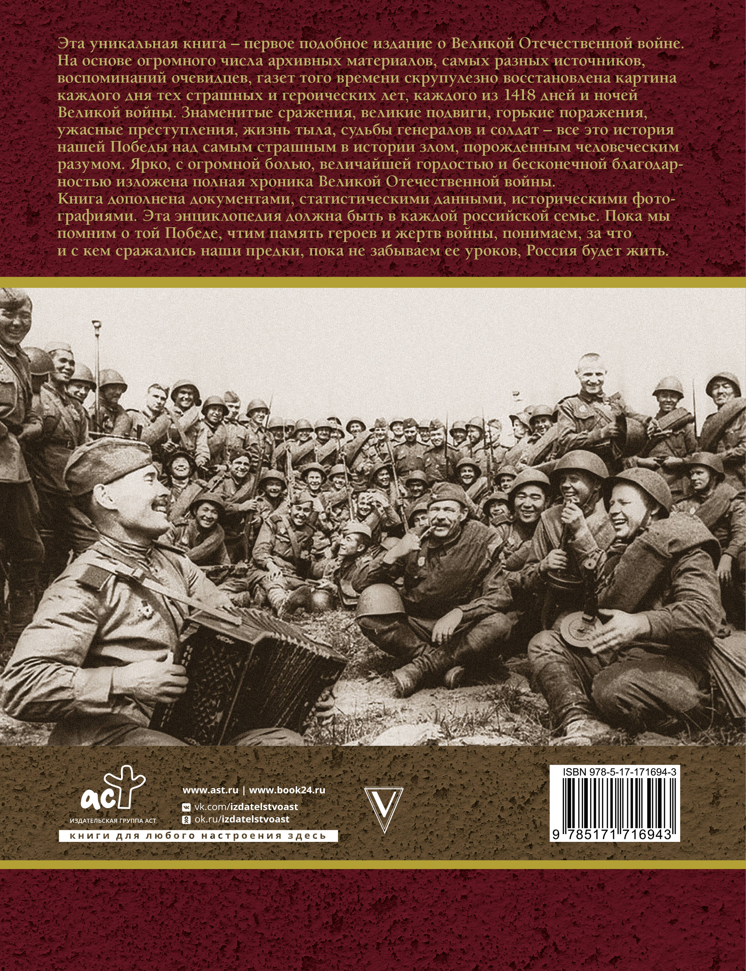 Эта уникальная книга - первое подобное издание о Великой Отечественной войне. На основе огромного числа архивных материалов, самых разных источников, воспоминаний очевидцев, газет того времени скрупулезно восстановлена картина каждого дня тех страшных и героических лет, каждого из 1418 дней и ночей Великой войны. Знаменитые сражения, великие подвиги, горькие поражения, ужасные преступления, жизнь тыла, судьбы генералов и солдат - все это история нашей Победы над самым страшным в истории злом, порожденным человеческим разумом. Ярко, с огромной болью, величайшей гордостью и бесконечной благодарностью изложена полная хроника Великой Отечественной войны. Книга дополнена документами, статистическими данными, историческими фотографиями. Эта энциклопедия должна быть в каждой российской семье. Пока мы помним о той Победе, чтим память героев и жертв войны, понимаем, за что и с кем сражались наши предки, пока не забываем ее уроков, Россия будет жить.| Издательство | Издательство "АСТ" |