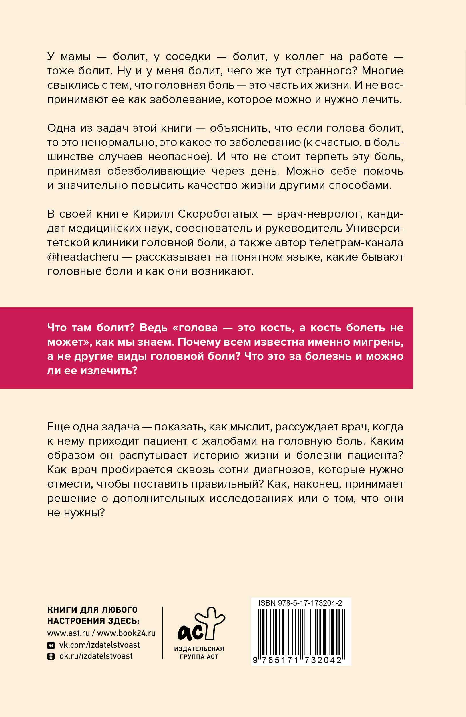 У мамы - болит, у соседки - болит, у коллег на работе - тоже болит. Ну и у меня болит, чего же тут странного? Многие свыклись с тем, что головная боль - это часть их жизни. И не воспринимают ее как заболевание, которое можно и нужно лечить. Одна из задач этой книги - объяснить, что если голова болит, то это ненормально, это какое-то заболевание (к счастью, в большинстве случаев неопасное). И что не стоит терпеть эту боль, принимая обезболивающие через день. Можно себе помочь и значительно повысить качество жизни другими способами. В своей книге Кирилл Скоробогатых - врач-невролог, кандидат медицинских наук, сооснователь и руководитель Университетской клиники головной боли - рассказывает на понятном языке, какие бывают головные боли и как они возникают. Что там болит? Ведь "голова - это кость, а кость болеть не может", как мы знаем. Почему всем известна именно мигрень, а не другие виды головной боли? Что это за болезнь и можно ли ее излечить? Еще одна задача - показать, как мыслит, рассуждает врач, когда к нему приходит пациент с жалобами на головную боль. Каким образом он распутывает историю жизни и болезни пациента? Как врач пробирается сквозь сотни диагнозов, которые нужно отмести, чтобы поставить правильный? Как, наконец, принимает решение о дополнительных исследованиях или о том, что они не нужны?| Издательство | Издательство "АСТ" |