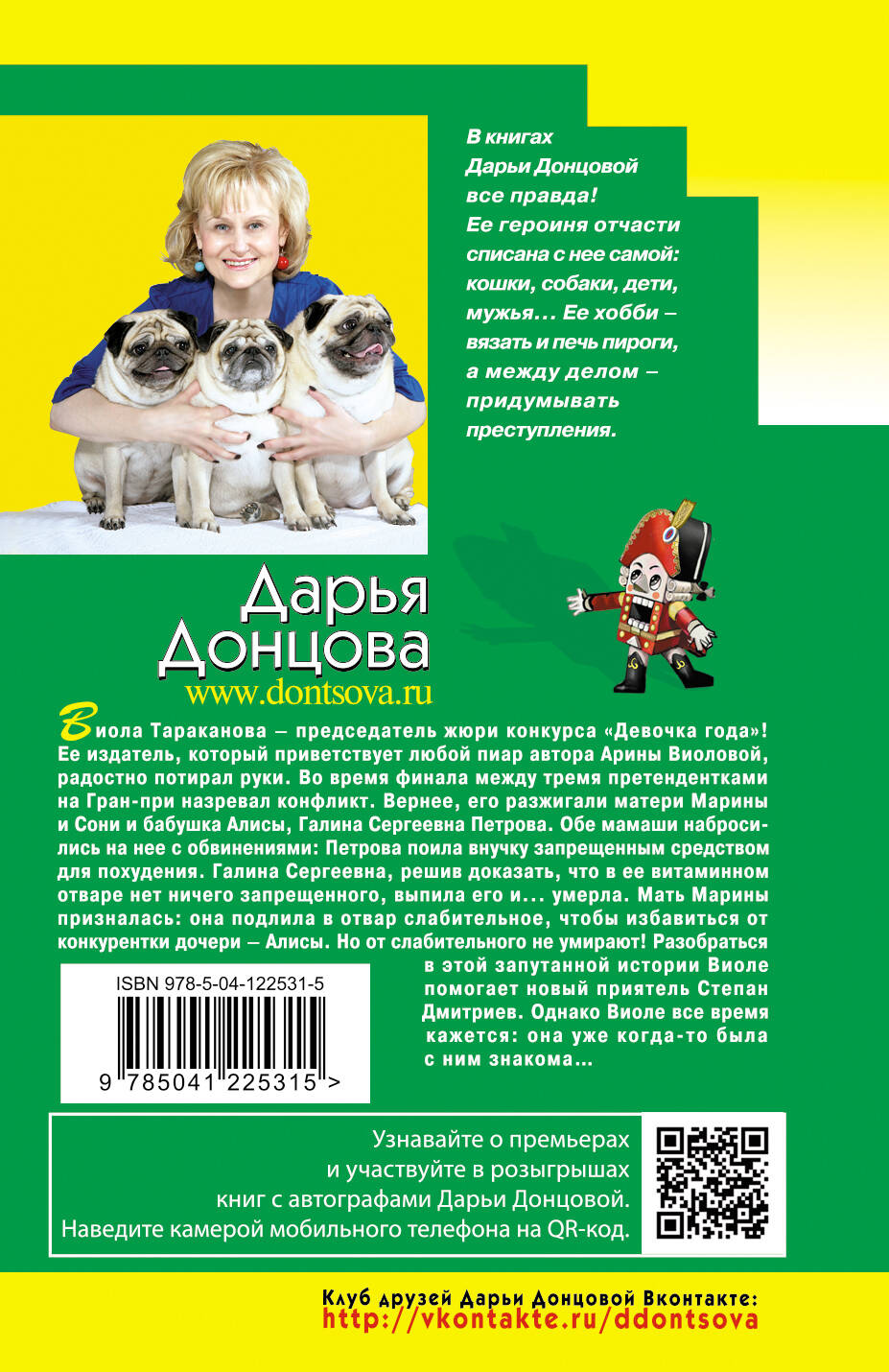 Виола Тараканова - председатель жюри конкурса «Девочка года»! Ее издатель, который приветствует любой пиар автора Арины Виоловой, радостно потирал руки. Во время финала между тремя претендентками на Гран-при назревал конфликт. Вернее его разжигали матери Марины и Сони и бабушка Алисы, Галина Сергеевна Петрова. Обе мамаши набросились на нее с обвинениями: Петрова поила внучку запрещенным средством для похудания. Галина Сергеевна, решив доказать, что в ее витаминном отваре нет ничего запрещенного, выпила его и... умерла. Мать Марины призналась: она подлила в отвар слабительное, чтобы избавиться от конкурентки дочери - Алисы. Но от слабительного не умирают! Разобраться в этой запутанной истории Виоле помогает новый приятель Степан Дмитриев. Однако Виоле все время кажется: она уже когда-то была с ним знакома… Дарья Донцова - самый популярный и востребованный автор в нашей стране, любимица миллионов читателей. В России продано более 200 миллионов экземпляров ее книг. Ее творчество наполняет сердца и души светом, оптимизмом, радостью, уверенностью в завтрашнем дне! «Донцова невероятная работяга! Я не знаю ни одного другого писателя, который столько работал бы. Я отношусь к ней с уважением, как к образцу писательского трудолюбия. Женщины нуждаются в психологической поддержке и получают ее от Донцовой. Я и сама в свое время прочла несколько романов Донцовой. Ее читают очень разные люди. И очень занятые бизнес-леди, чтобы на время выключить голову, и домохозяйки, у которых есть перерыв 15-20 минут между отвести-забрать детей». - Галина Юзефович, литературный критик.| Издательство | ООО "Издательство "Эксмо" |