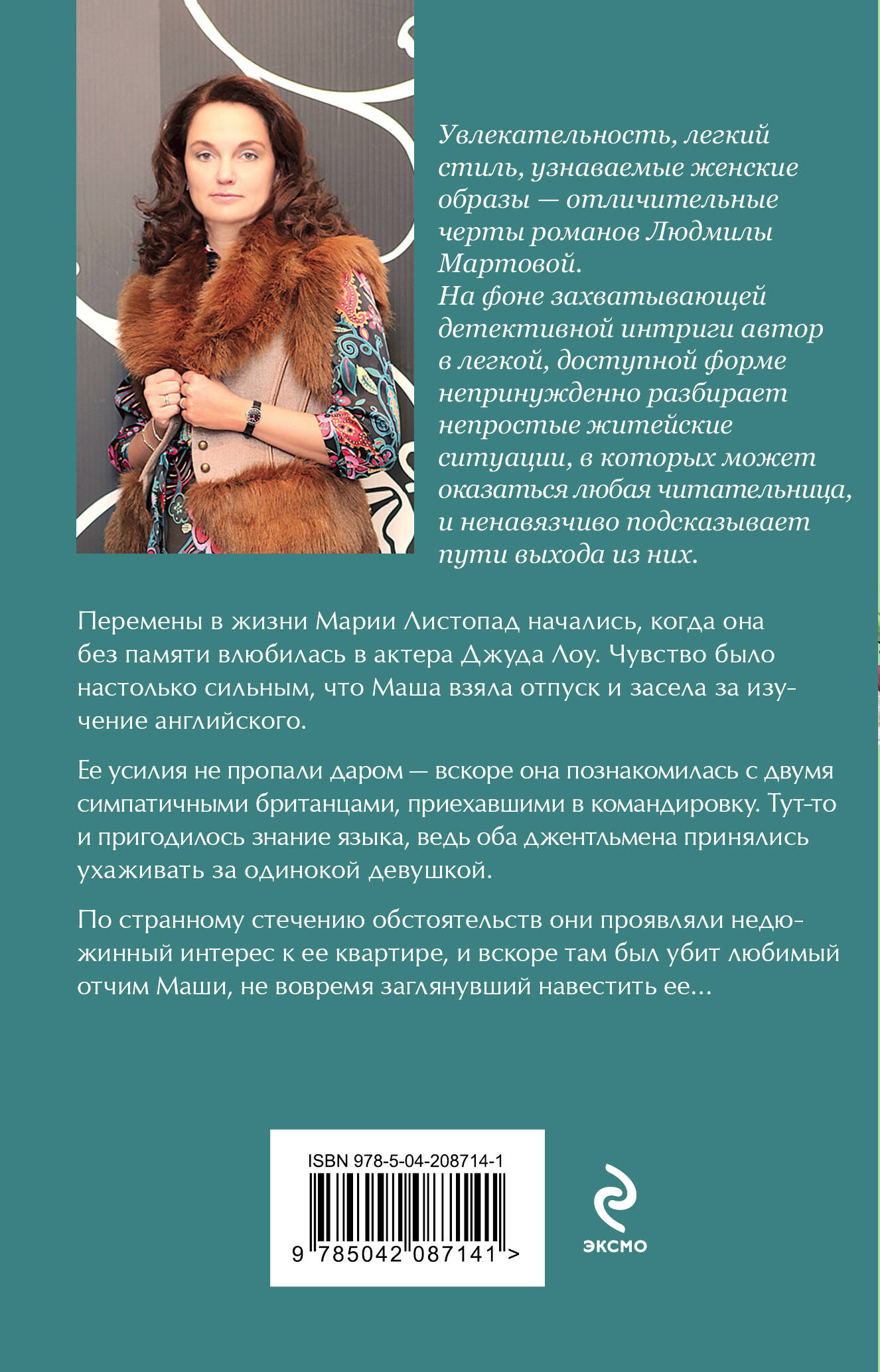 Перемены в жизни Марии Листопад начались, когда она без памяти влюбилась в актера Джуда Лоу. Чувство было настолько сильным, что Маша взяла отпуск и засела за изучение английского. Ее усилия не пропали даром - вскоре она познакомилась с двумя симпатичными британцами, приехавшими в командировку. Тут-то и пригодилось знание языка, ведь оба джентльмена принялись ухаживать за одинокой девушкой. По странному стечению обстоятельств, они проявляли недюжинный интерес к ее квартире, и вскоре там был убит любимый отчим Маши, не вовремя заглянувший навестить ее… Людмила Мартова - мастер увлекательной детективной мелодрамы, автор захватывающих остросюжетных историй. Их отличают закрученная детективная интрига, лихой финал с неожиданной развязкой и, конечно же, яркая любовная линия. Героини романов Людмилы Мартовой - современные молодые женщины, которые точно знают, чего хотят от жизни.| Издательство | ООО "Издательство "Эксмо" |
