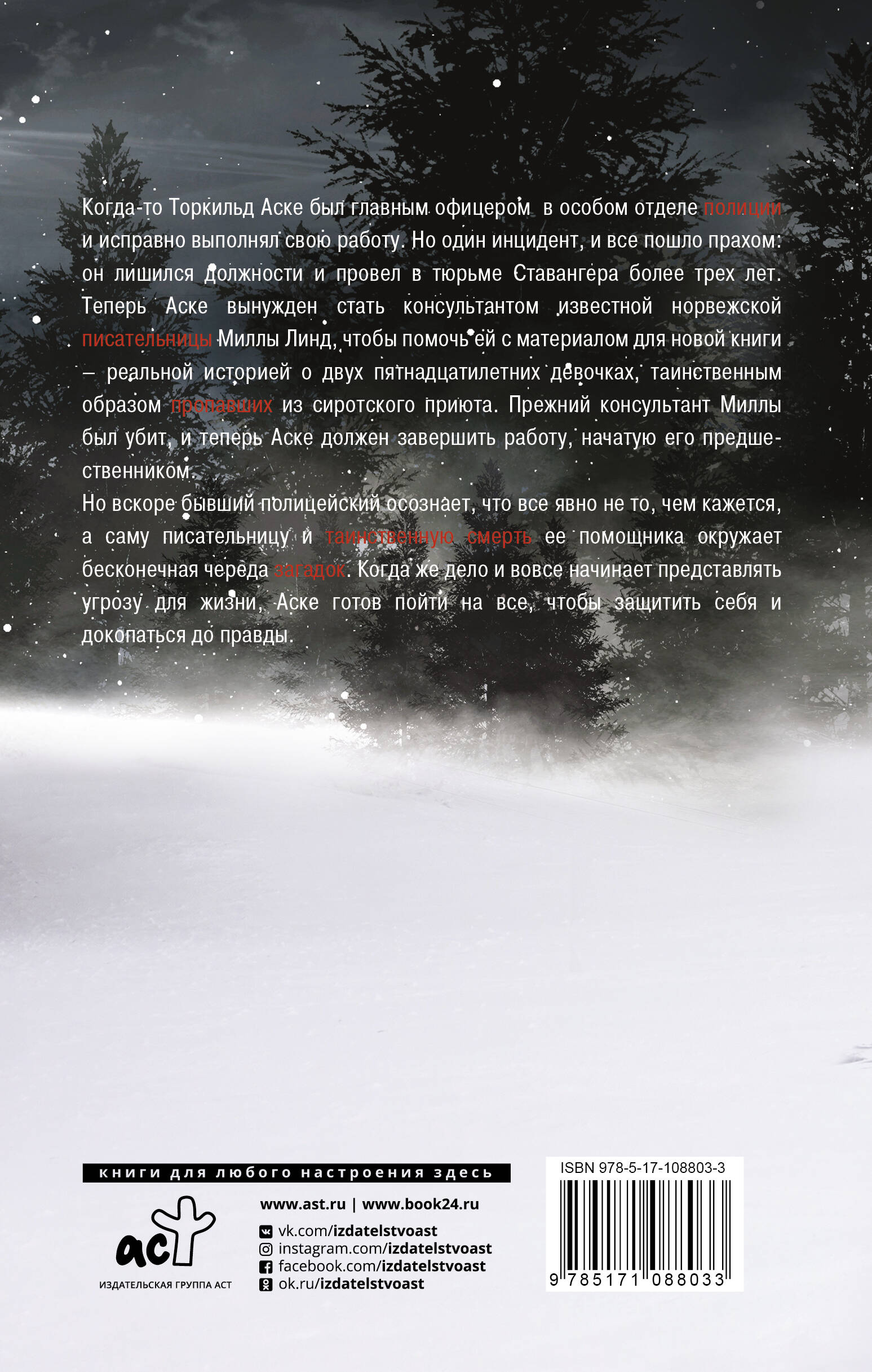 Когда-то Торкильд Аске был главным офицером в особом отделе полиции и исправно выполнял свою работу. Но один инцидент и всё пошло прахом: он лишился должности и провел в тюрьме Ставангера более трех лет. Перебиваясь подработками, Аске соглашается стать консультантом известной норвежской писательницы Миллы Линд, чтобы помочь ей с материалом для новой книги-- реальной историей о двух пятнадцатилетних девочках, таинственным образом пропавших из сиротского приюта. Прежний консультант Миллы был застрелен, и теперь Аске должен закончить работу, начатую им. Но вскоре бывший полицейский понимает, что все явно не то, чем кажется, а саму писательницу и таинственную смерть её помощника окружает бесконечная череда загадок. Когда же дело и вовсе начинает представлять угрозу для его жизни, Аске готов пойти на все, чтобы защитить себя и докопаться до правды.| Издательство | ИЗДАТЕЛЬСТВО "АСТ" |