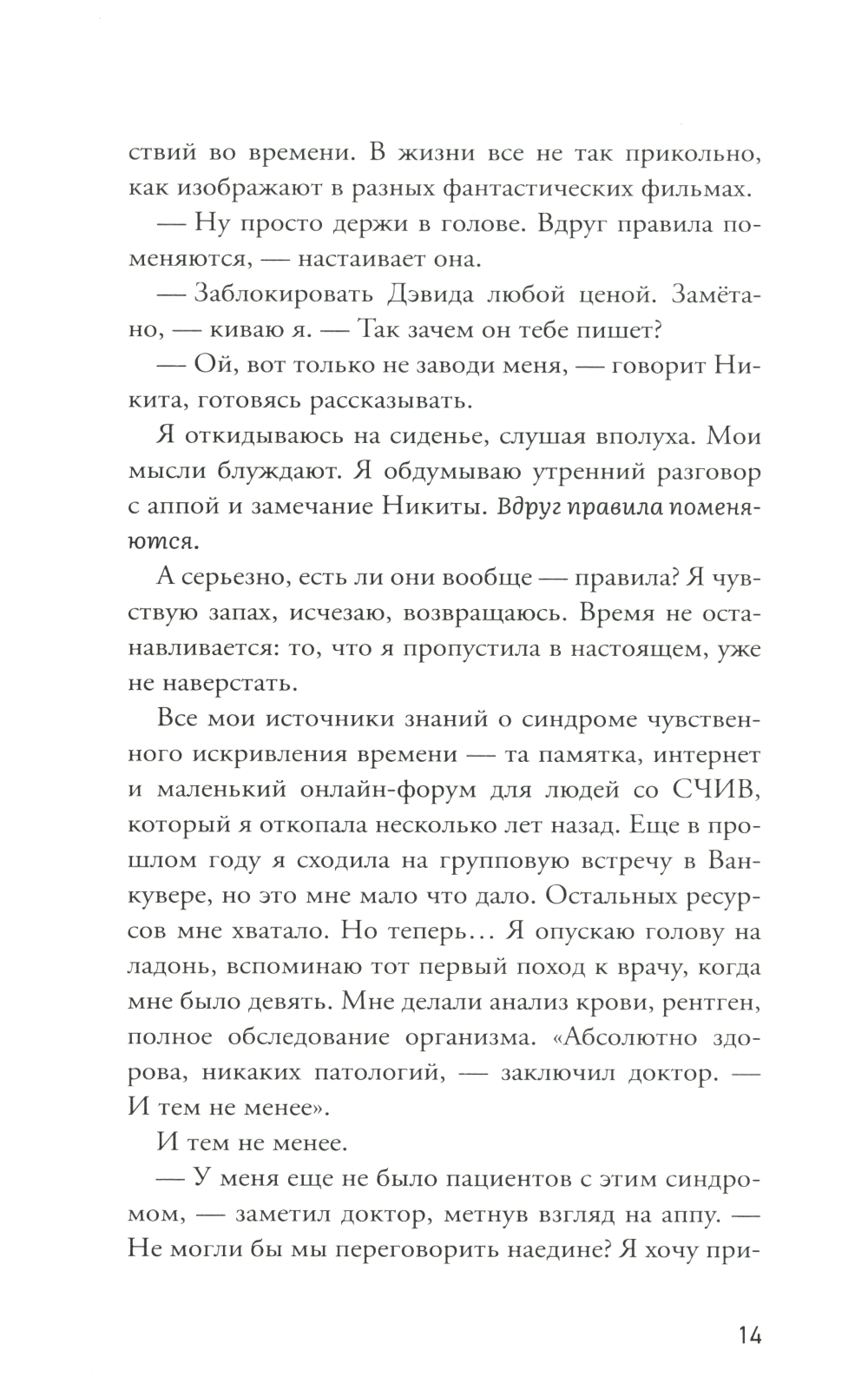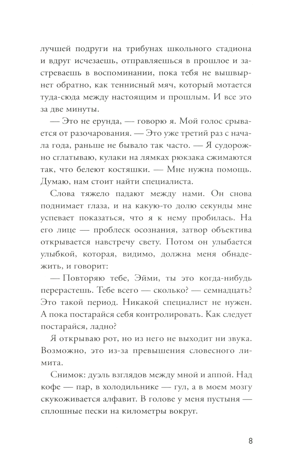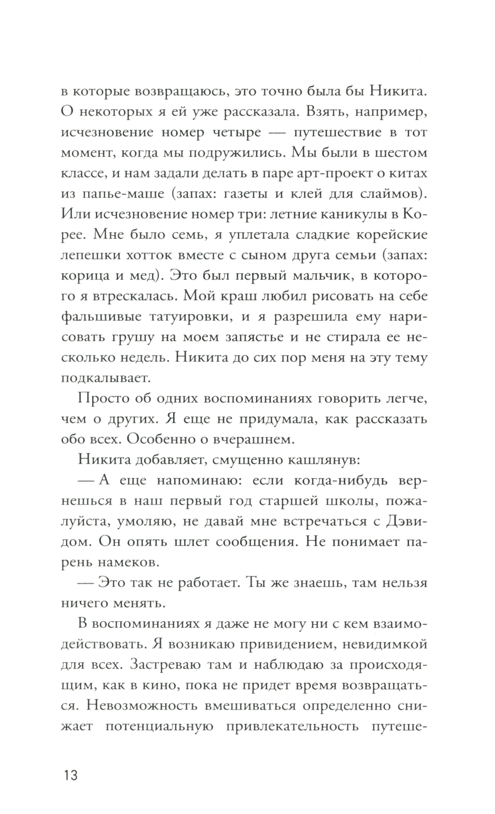 Молодежная драма с азиатскими мотивами и путешествием во времени. Роман занял первое место на Amazon среди новинок в категории американо-азиатского young adult фэнтези. Мама и папа Эйми Ро родом из Кореи, но сама она выросла в Канаде. Как и ее семнадцатилетние сверстники, девушка ходит в школу, веселится с друзьями и гадает, что ждет ее в будущем. Эйми с детства живет с очень редкой болезнью - СЧИВ, синдромом чувственного искривления времени. Вдохнув аромат, связанный с тем или иным воспоминанием, девушка исчезает из настоящего и переносится назад во времени, к этому воспоминанию. Не в силах ничего изменить или вмешаться, она лишь наблюдает за своими поступками в прошлом, а затем вновь оказывается в настоящем. Для Эйми такие «прыжки» - единственная возможность вновь увидеть маму, пропавшую много лет назад. Но что, если эта же болезнь заперла в прошлом и ее маму, исчезнувшую больше десяти лет назад? Теперь, чтобы перестать бояться жить, девушке предстоит отправиться на Родину родителей и узнать правду о маме, отце... и о себе. Ведь будущее самой Эйми не наступит, пока прошлое держит ее в плену.