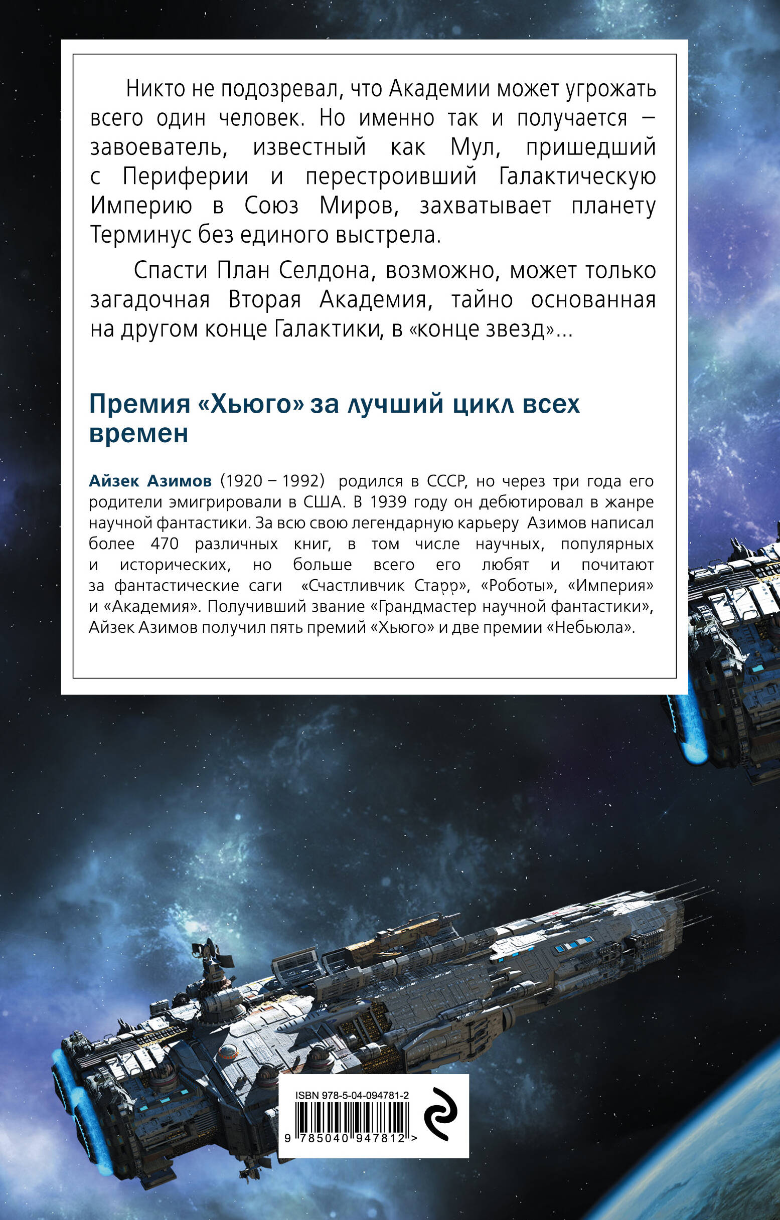 Окончание трилогии «Академия», получившей премию «Хьюго» как «Лучший книжный сериал всех времен». Самое известное произведение Айзека Азимова в составе прекрасно оформленного трехтомника. Окончание цикла «Академия» великого Айзека Азимова. Книга из трилогии, названной «Лучшим циклом всех времен». Ученым из Академии приходится бороться с мутантом-телепатом Мулом, который планирует захватить Галактику. Современное переиздание классического романа. По трилогии идут съемки сериала.| Издательство | ООО "Издательство "Эксмо" |