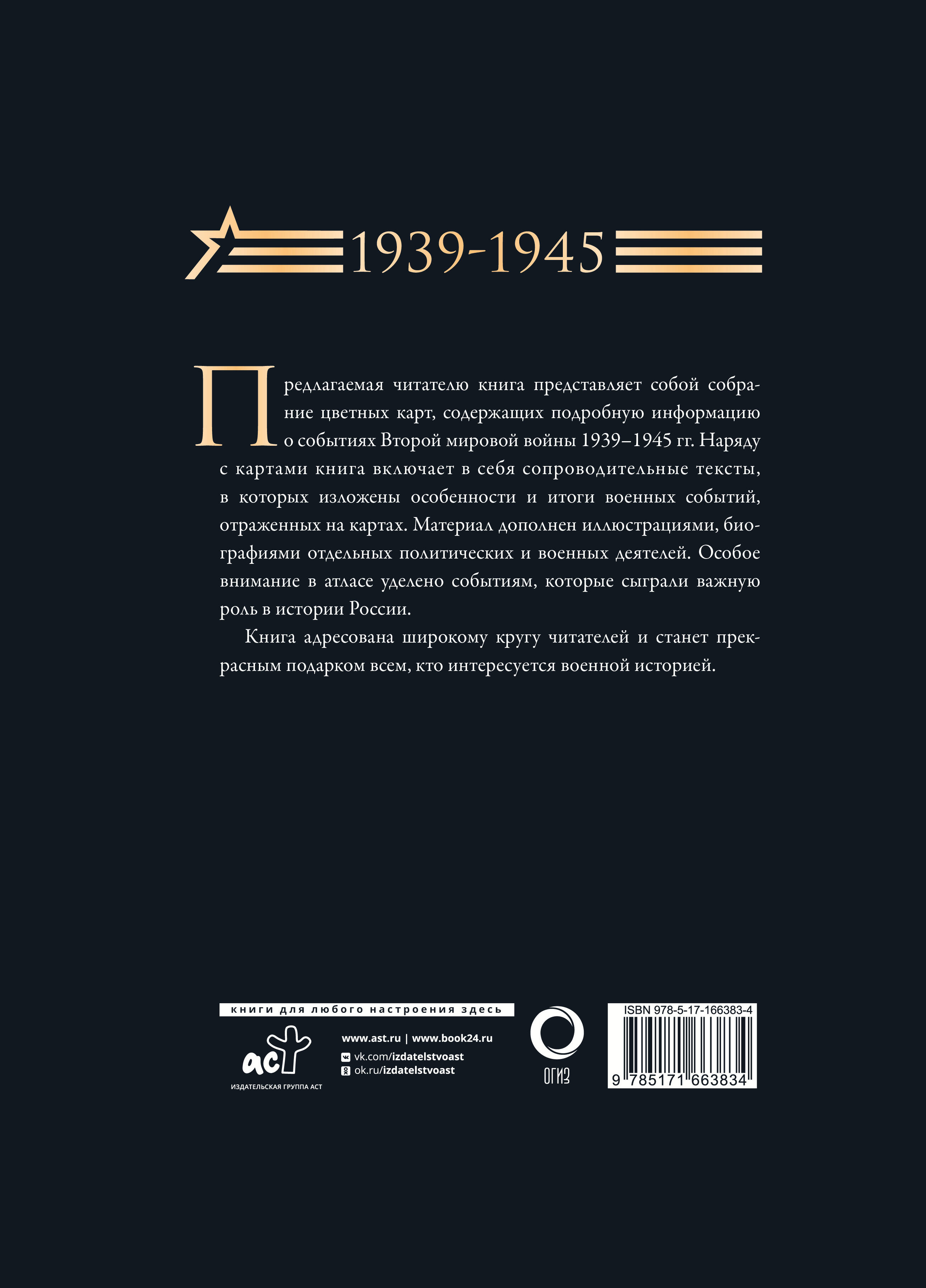 Предлагаемая читателю книга представляет собой собрание цветных карт, содержащих подробную информацию о событиях Второй мировой войны 1939-1945 гг. Наряду с картами книга включает в себя сопроводительные тексты, в которых изложены особенности и итоги военных событий, отраженных на картах. Материал дополнен иллюстрациями, биографиями отдельных политических и военных деятелей. Особое внимание в атласе уделено событиям, которые сыграли важную роль в истории России. Книга адресована широкому кругу читателей и станет прекрасным подарком всем, кто интересуется военной историей.| Издательство | Издательство "АСТ" |