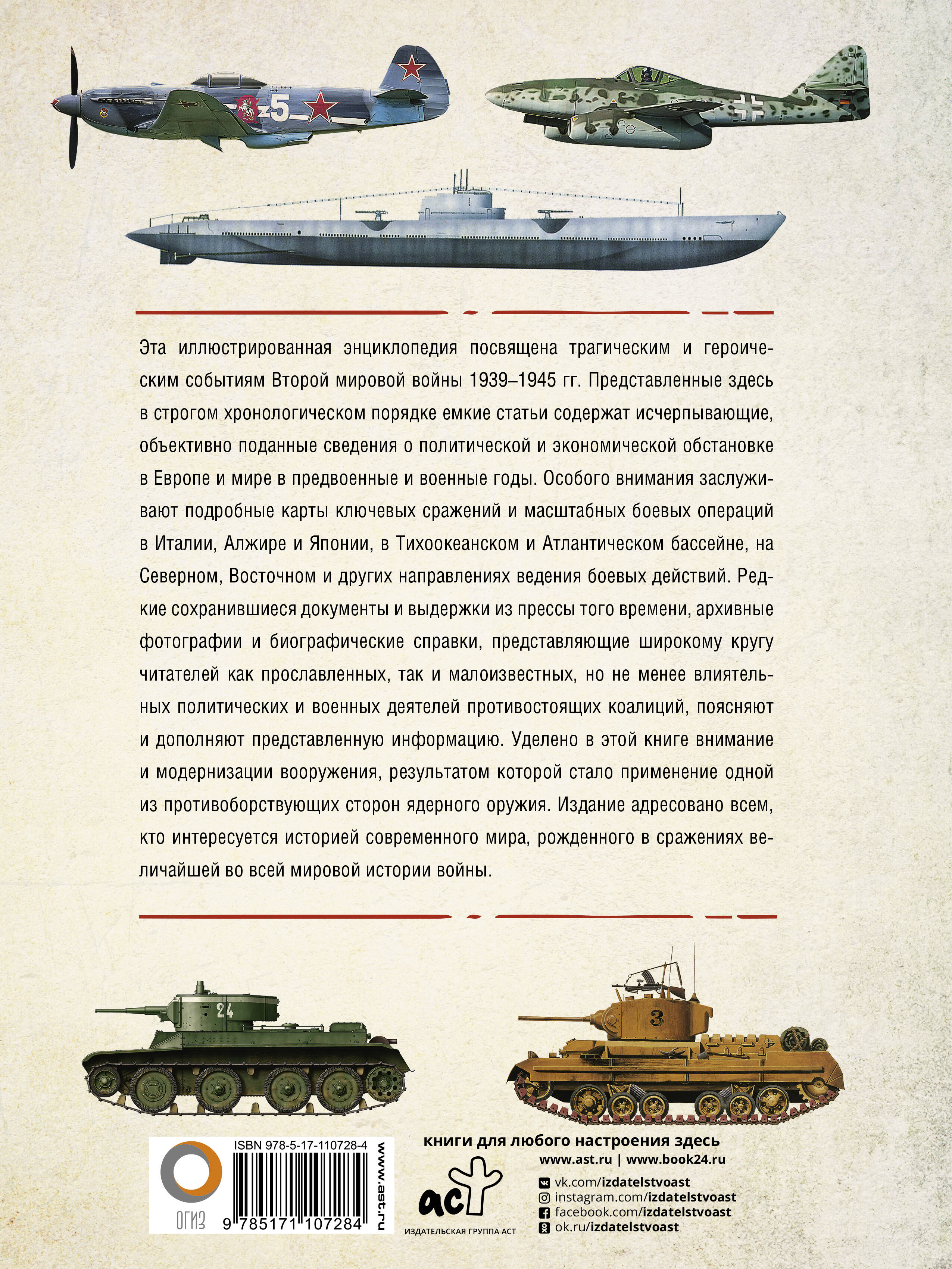 Эта иллюстрированная энциклопедия посвящена трагическим и героическим событиям Второй мировой войны 1939-1945 гг. Представленные здесь в хронологическом порядке емкие статьи содержат исчерпывающие объективно поданные сведения о политической и экономической обстановке в Европе и мире в предвоенные и военные годы. Уделено внимание и модернизации вооружения, результатом которой стало применение одной из противоборствующих сторон ядерного оружия. Особого внимания заслуживают подробные карты ключевых сражений и масштабных боевых операций в Италии, Алжире и Японии, в Тихоокеанском и Атлантическом бассейнах, на Северном, Восточном и других направлениях ведения боевых действий. Редкие сохранившиеся документы и выдержки из прессы того времени, архивные фотографии и биографические справки, представляющие читателю как прославленных, так и малоизвестных, но не менее влиятельных политических и военных деятелей противостоящих коалиций, поясняют и дополняют представленную информацию. Издание адресовано всем, кто интересуется военной историей.| Издательство | ИЗДАТЕЛЬСТВО "АСТ" |