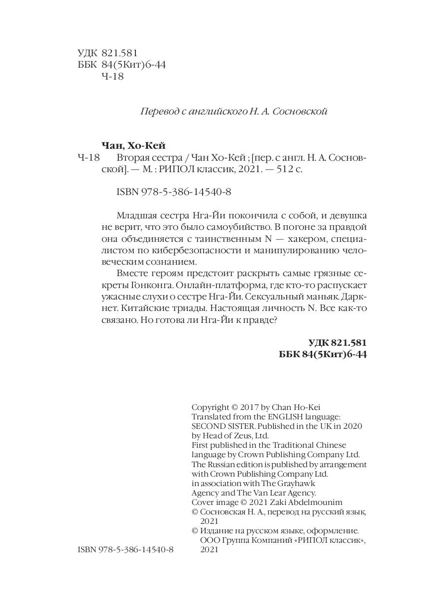 Младшая сестра Нга-Йи покончила с собой, и девушка не верит, что это было самоубийство. В погоне за правдой она объединяется с таинственным N - хакером, специалистом по кибербезопасности и манипулированию человеческим сознанием. Вместе героям предстоит раскрыть самые грязные секреты Гонконга. Онлайн-платформа, где кто-то распускает ужасные слухи о сестре Нга-Йи. Сексуальный маньяк. Даркнет. Китайские триады. Настоящая личность N. Все как-то связано. Но готова ли Нга-Йи к правде?| Издательство | Рипол Классик |