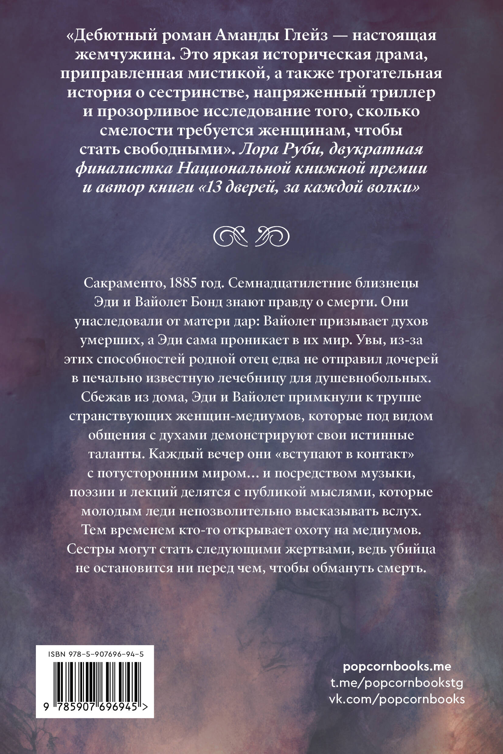 Сакраменто, 1885 год. Семнадцатилетние близнецы Эди и Вайолет Бонд знают правду о смерти. Они унаследовали от матери дар: Вайолет призывает духов умерших, а Эди сама проникает в их мир. Увы, из-за этих способностей родной отец едва не отправил дочерей в печально известную лечебницу для душевнобольных. Сбежав из дома, Эди и Вайолет примкнули к труппе странствующих женщин-медиумов, которые под видом общения с духами демонстрируют свои истинные таланты. Каждый вечер они «вступают в контакт» с потусторонним миром… и посредством музыки, поэзии и лекций делятся с публикой мыслями, которые молодым леди непозволительно высказывать вслух. Тем временем кто-то открывает охоту на медиумов. Сестры могут стать следующими жертвами, ведь убийца не остановится ни перед чем, чтобы обмануть смерть.| Издательство | ООО "Издательство "Эксмо" |