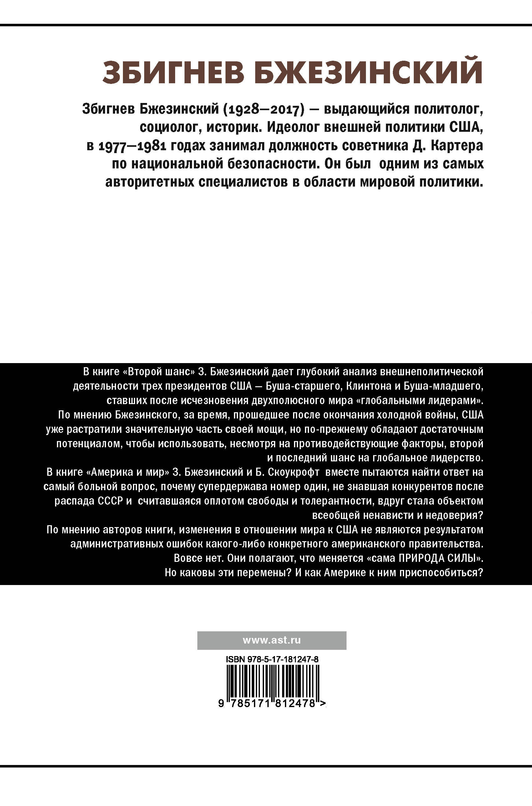 Збигнев Бжезинский (1928-2017) - выдающийся политолог, социолог, историк. Идеолог внешней политики США, в 1977-1981 годах занимал должность советника Д. Картера по национальной безопасности. Он был одним из самых авторитетных специалистов в области мировой политики. В книге "Второй шанс" З. Бжезинский дает глубокий анализ внешнеполитической деятельности трех президентов США - Буша-старшего, Клинтона и Буша-младшего, ставших после исчезновения двухполюсного мира "глобальными лидерами". По мнению Бжезинского, за время, прошедшее после окончания холодной войны, США уже растратили значительную часть своей мощи, но по-прежнему обладают достаточным потенциалом, чтобы использовать, несмотря на противодействующие факторы, второй и последний шанс на глобальное лидерство. В книге "Америка и мир" З. Бжезинский и Б. Скоукрофт вместе пытаются найти ответ на самый больной вопрос, почему супердержава номер один, не знавшая конкурентов после распада СССР и считавшаяся оплотом свободы и толерантности, вдруг стала объектом всеобщей ненависти и недоверия? По мнению авторов книги, изменения в отношении мира к США не являются результатом административных ошибок какого-либо конкретного американского правительства. Вовсе нет. Они полагают, что меняется "сама ПРИРОДА СИЛЫ". Но каковы эти перемены? И как Америке к ним приспособиться?| Издательство | Издательство "АСТ" |