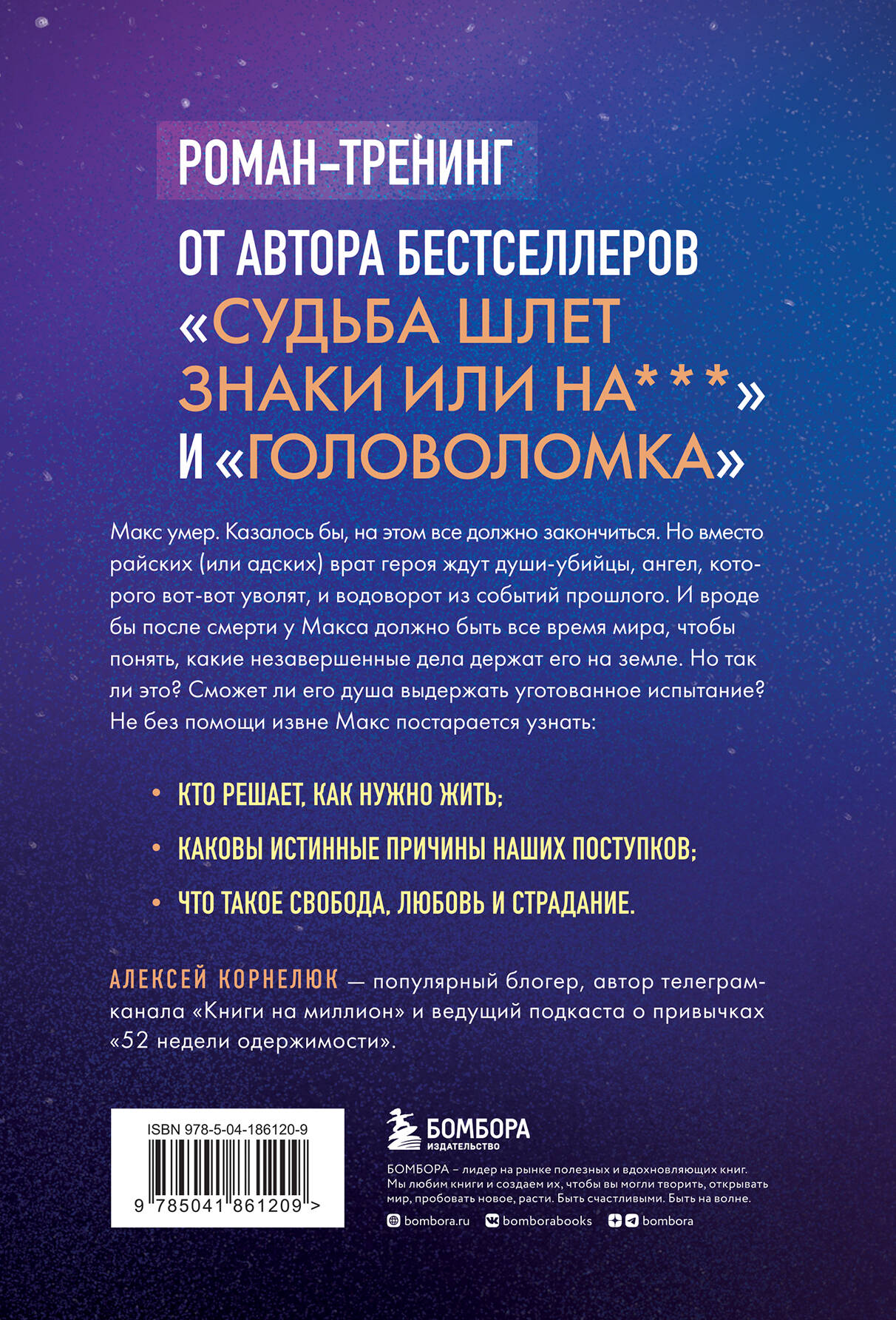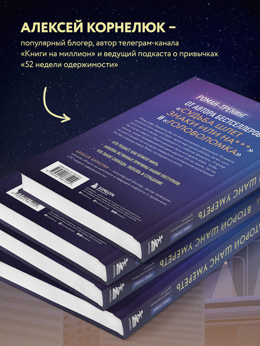 Роман-тренинг от автора бестселлеров «Судьба шлет знаки или на***» и «Головоломка». Макс умер. Казалось бы, на этом все должно закончиться. Но вместо райских (или адских) врат героя ждут души-убийцы, ангел, которого вот-вот уволят, и водоворот из событий прошлого. И вроде бы после смерти у Макса должно быть все время мира, чтобы понять, какие незавершенные дела держат его на Земле. Но так ли это? Сможет ли его душа пройти уготованное испытание? Не без помощи извне Макс постарается узнать: • кто решает, как нужно жить; • каковы истинные причины наших поступков; • что такое свобода, любовь и страдание. Алексей Корнелюк - популярный блогер, автор телеграм-канала «Книги на миллион» и ведущий подкаста о привычках «52 недели одержимости».| Издательство | ООО "Издательство "Эксмо" |