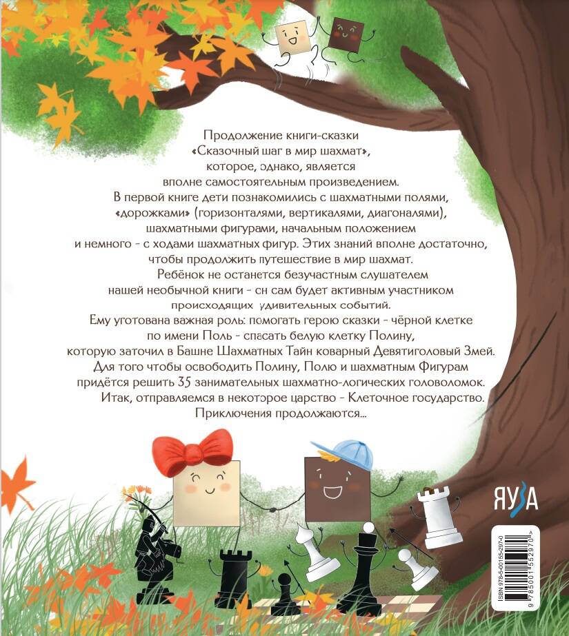 Продолжение книги-сказки "Сказочный шаг в мир шахмат". В первой книге дети познакомились с шахматными полями, "дорожками" (горизонталями, вертикалями, диагоналями), шахматными фигурами, начальным положением и с ходами шахматных фигур. Этих знаний достаточно, чтобы продолжить путешествие в мир шахмат. Ребёнок не останется безучастным слушателем нашей необычной книги - он будет активным участником удивительных событий. Ему уготована важная роль: помогать герою сказки - чёрной клетке по имени Поль - спасать белую клетку Полину, которую заточил в Башне Шахматных Тайн коварный Девятиголовый Змей. Для того чтобы освободить Полину, Полю и шахматным Фигурам придётся решить 35 занимательных шахматно-логических головоломок. Итак, отправляемся в некоторое царство - Клеточное государство. При ключения продолжаются...| Издательство | Яуза-каталог ООО |