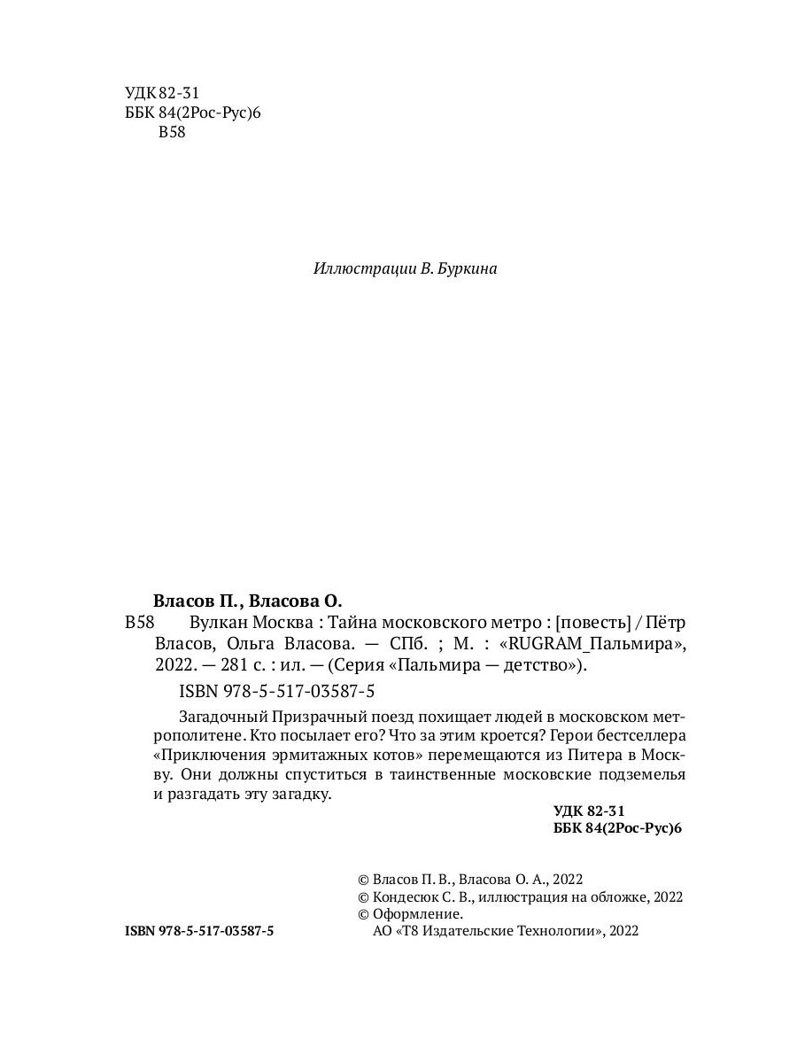 Загадочный Призрачный поезд похищает людей в московском метрополитене. Кто посылает его? Что за этим кроется? Герои бестселлера «Приключения эрмитажных котов» перемещаются из Питера в Москву. Они должны спуститься в таинственные московские подземелья и разгадать эту загадку.| Издательство | Т8 RUGRAM |