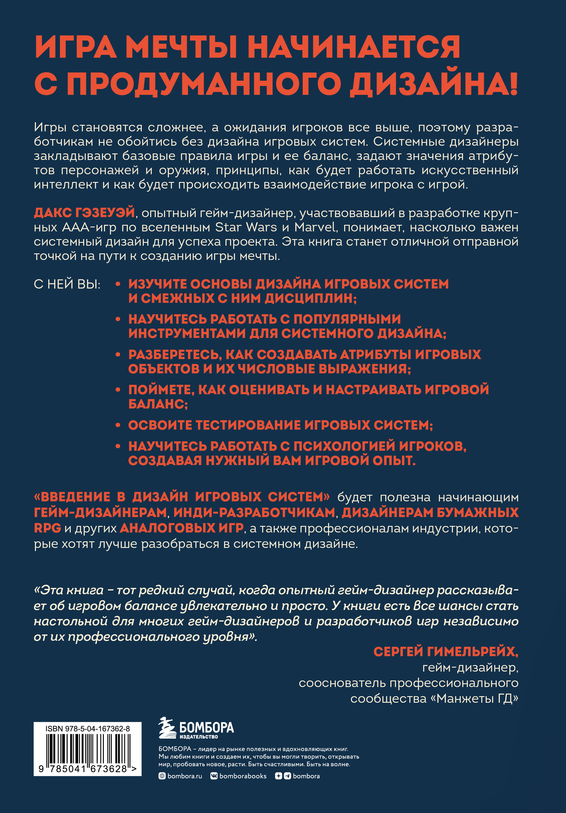 Игра мечты начинается с продуманного дизайна! Игры становятся сложнее, а ожидания игроков все выше, поэтому разработчикам не обойтись без дизайна игровых систем. Системные дизайнеры закладывают базовые правила игры и ее баланс, задают значения атрибутов персонажей и оружия, принципы, как будет работать искусственный интеллект и как будет происходить взаимодействие игрока с игрой. Дакс Гэзеуэй, опытный гейм-дизайнер, участвовавший в разработке крупных ААА-игр по вселенным Star Wars и Marvel, понимает насколько важен системный дизайн для успеха проекта. Эта книга станет отличной отправной точкой на пути к созданию игры мечты. С ней вы: - Изучите основы дизайна игровых систем и смежных с ним дисциплин. - Научитесь работать с популярными инструментами для системного дизайна. - Узнаете, как придумывать игровые системы с нуля. - Разберетесь, как создавать атрибуты игровых объектов и их числовые выражения. - Поймете, как оценивать и настраивать игровой баланс. - Освоите тестирование игровых систем. - Научитесь работать с психологией игроков, создавая нужный вам игровой опыт. «Введение в дизайн игровых систем» будет полезна начинающим гейм-дизайнерам, инди-разработчикам, дизайнерам бумажных RPG и других аналоговых игр, а также профессионалам индустрии, которые хотят лучше разобраться в системном дизайне. «Эта книга - тот редкий случай, когда опытный гейм-дизайнер рассказывает об игровом балансе увлекательно и просто. У книги есть все шансы стать настольной для многих гейм-дизайнеров и разработчиков игр независимо от их профессионального уровня». - Сергей Гимельрейх, гейм-дизайнер, сооснователь профессионального сообщества «Манжеты ГД»| Издательство | ООО "Издательство "Эксмо" |