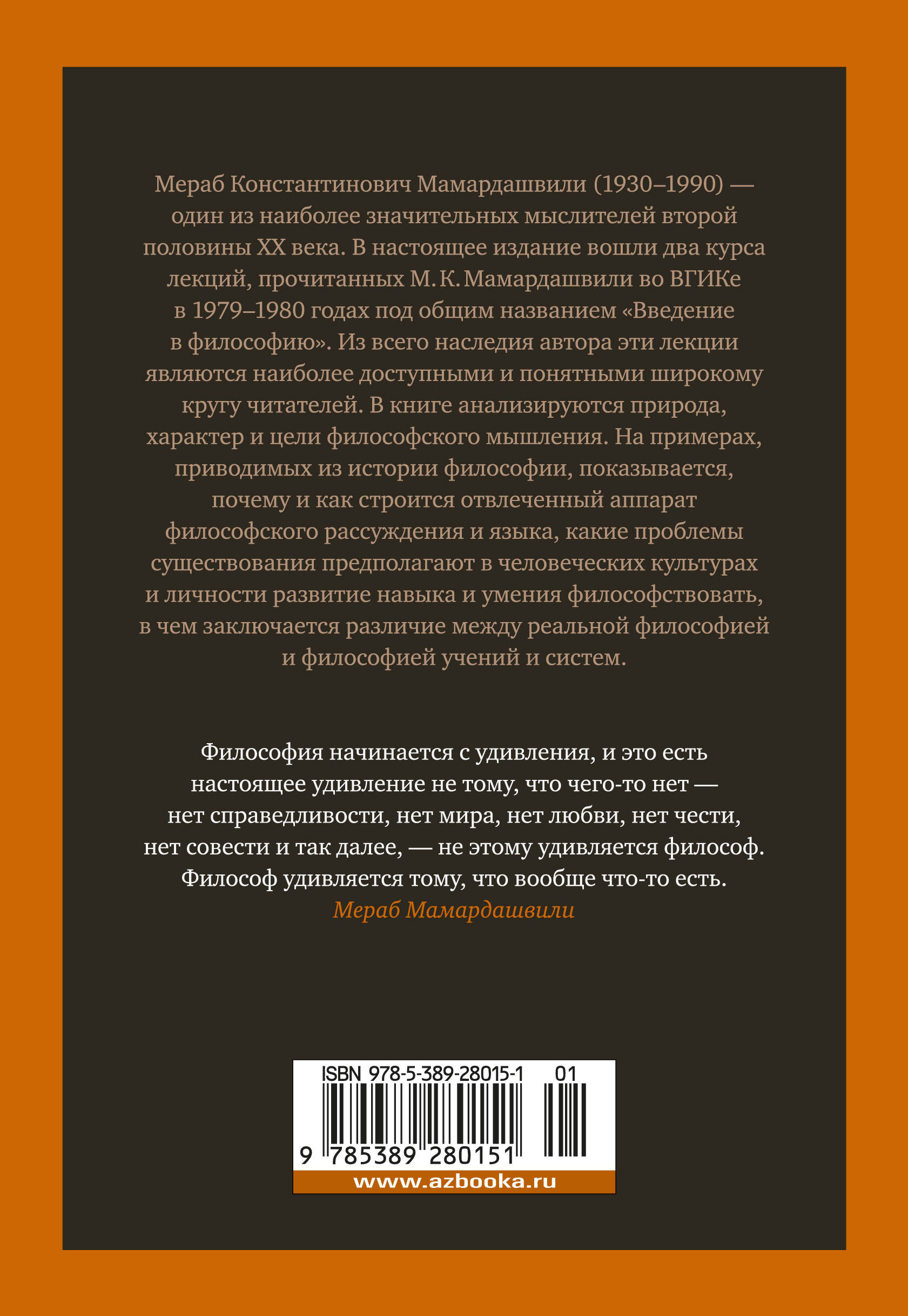 Мераб Константинович Мамардашвили (1930-1990) - один из наиболее значительных мыслителей второй половины ХХ века. В настоящее издание вошли два курса лекций, прочитанных М. К. Мамардашвили во ВГИКе в 1979-1980 годах под общим названием "Введение в философию". Из всего наследия автора эти лекции являются наиболее доступными и понятными широкому кругу читателей. В книге анализируются природа, характер и цели философского мышления. На примерах, приводимых из истории философии, показывается, почему и как строится отвлеченный аппарат философского рассуждения и языка, какие проблемы существования предполагают в человеческих культурах и личности развитие навыка и умения философствовать, в чем заключается различие между реальной философией и философией учений и систем.| Издательство | Азбука-Аттикус Издат.группа ООО |