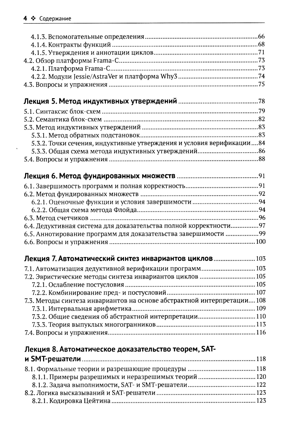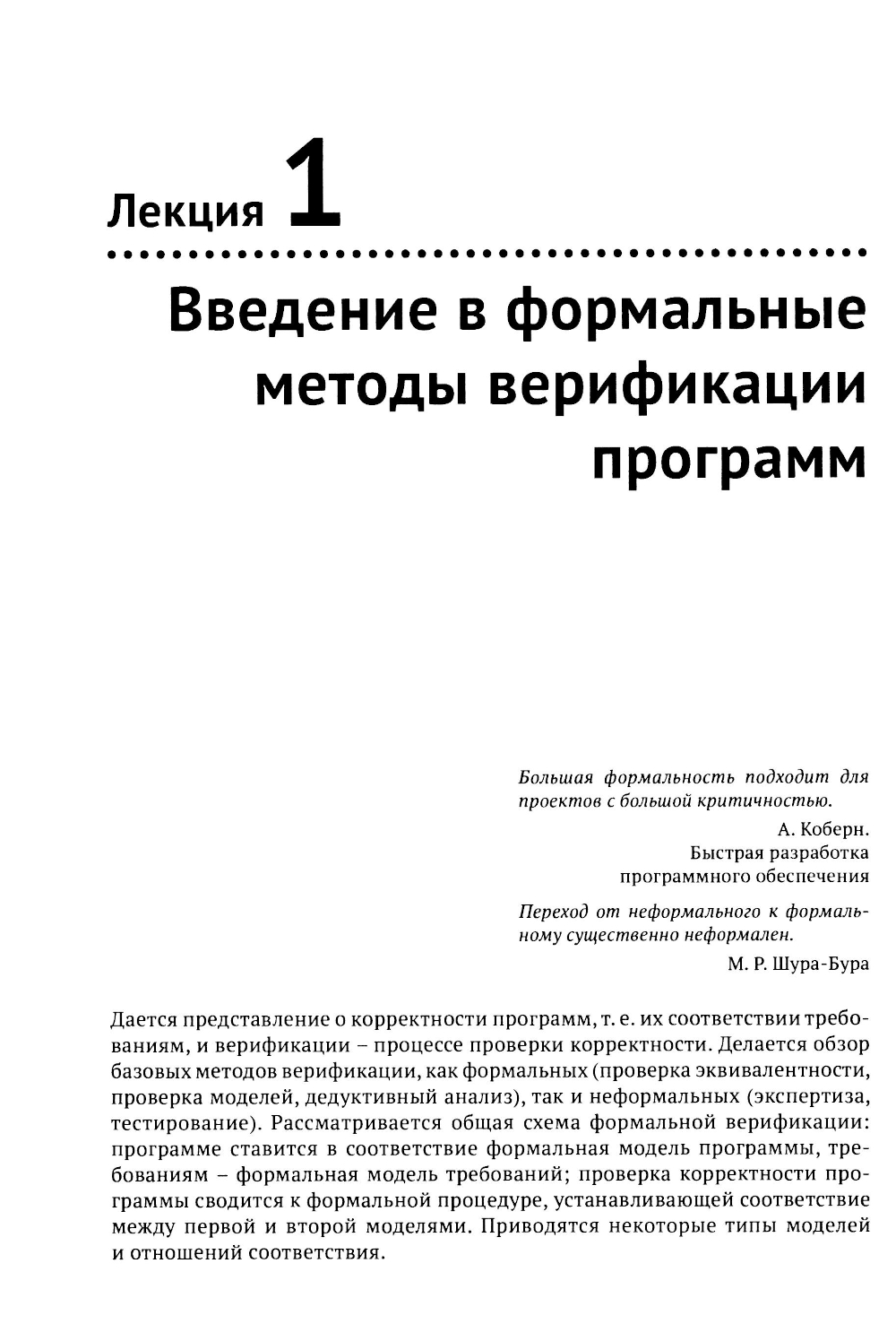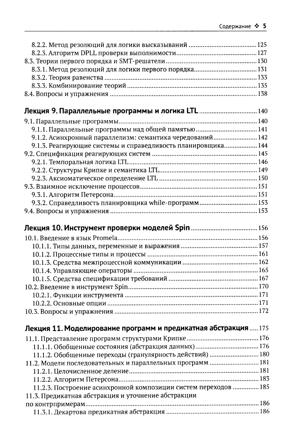 Книга основана на курсах лекций по формальным методам верификации программ, читаемых автором на кафедрах системного программирования МГУ, МФТИ и ВШЭ. Список тем включает: методы формализации семантики языков программирования (операционная и аксиоматическая семантика), методы формальной спецификации требований (программные контракты и темпоральная логика линейного времени), методы доказательства корректности программ (метод индуктивных утверждений и метод фундированных множеств) и методы проверки моделей (теоретико-автоматный подход в явной и символической формах); затрагиваются вопросы абстрактной интерпретации, разрешения ограничений, применения формальных методов в тестировании; даются сведения об инструментах Frama-C/AstraVer, Spin и SMV. Каждая глава сопровождается примерами и упражнениями. Книга предназначена для студентов и аспирантов программистских специальностей, а также преподавателей и исследователей в области информатики и программной инженерии.