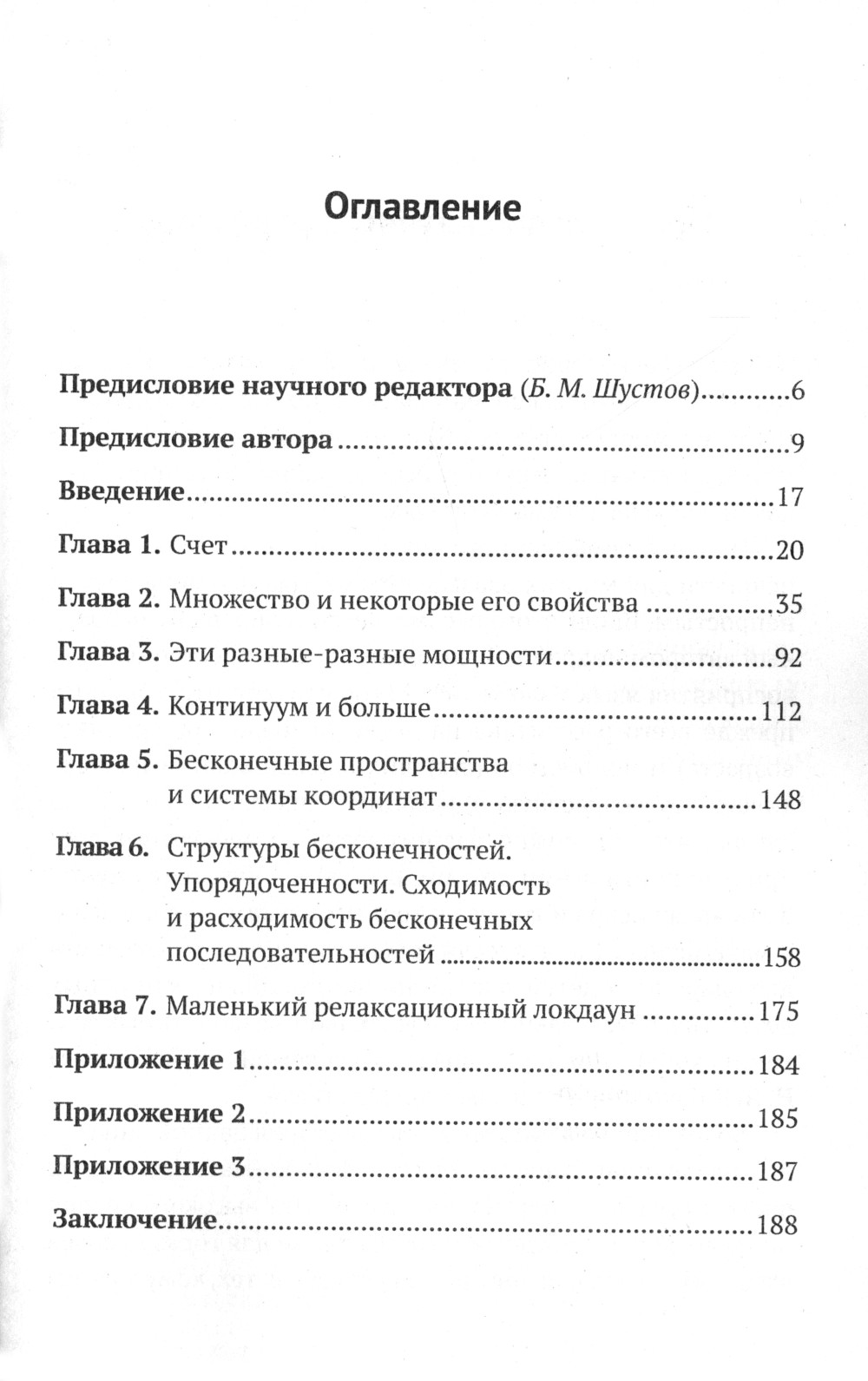 Предлагаемая книга предназначена прежде всего для подготовки школьников к трудностям освоения сложных математических понятий и операций, ожидающих их в естественно-научных и технических вузах с высоким уровнем преподавания математики. В ней пошагово, доступным языком проясняется понятие бесконечности практически во всем диапазоне его современных воплощений и некоторые другие связанные с ним понятия. Автор показывает, насколько разнообразными могут быть бесконечности (в строгом математическом понимании), приводит доказательства некоторых фундаментальных теорем, связанных с разными ипостасями бесконечности. Большое внимание уделено в книге множествам (как конечным, так и бесконечным), образуемым с помощью натуральных, а затем рациональных и действительных чисел, операциям с ними, а также функциям на этих множествах и множествам функций. При этом в качестве инструментов вводятся, объясняются и далее используются основные элементы теории множеств. Повествование ведется простым и доступным языком, при этом изложение материала удовлетворяет всем требованиям математической строгости. Книга будет полезна школьникам средних и старших классов, готовящимся к поступлению в вузы, студентам младших курсов, родителям детей, заинтересованных в глубоком освоении ими в перспективе высшей математики, а также широкому кругу читателей, интересующихся проблемой бесконечности в математике.| Издательство | ЛЕНАНД |