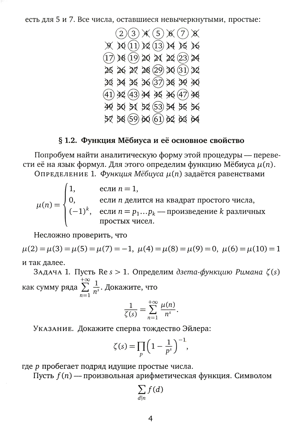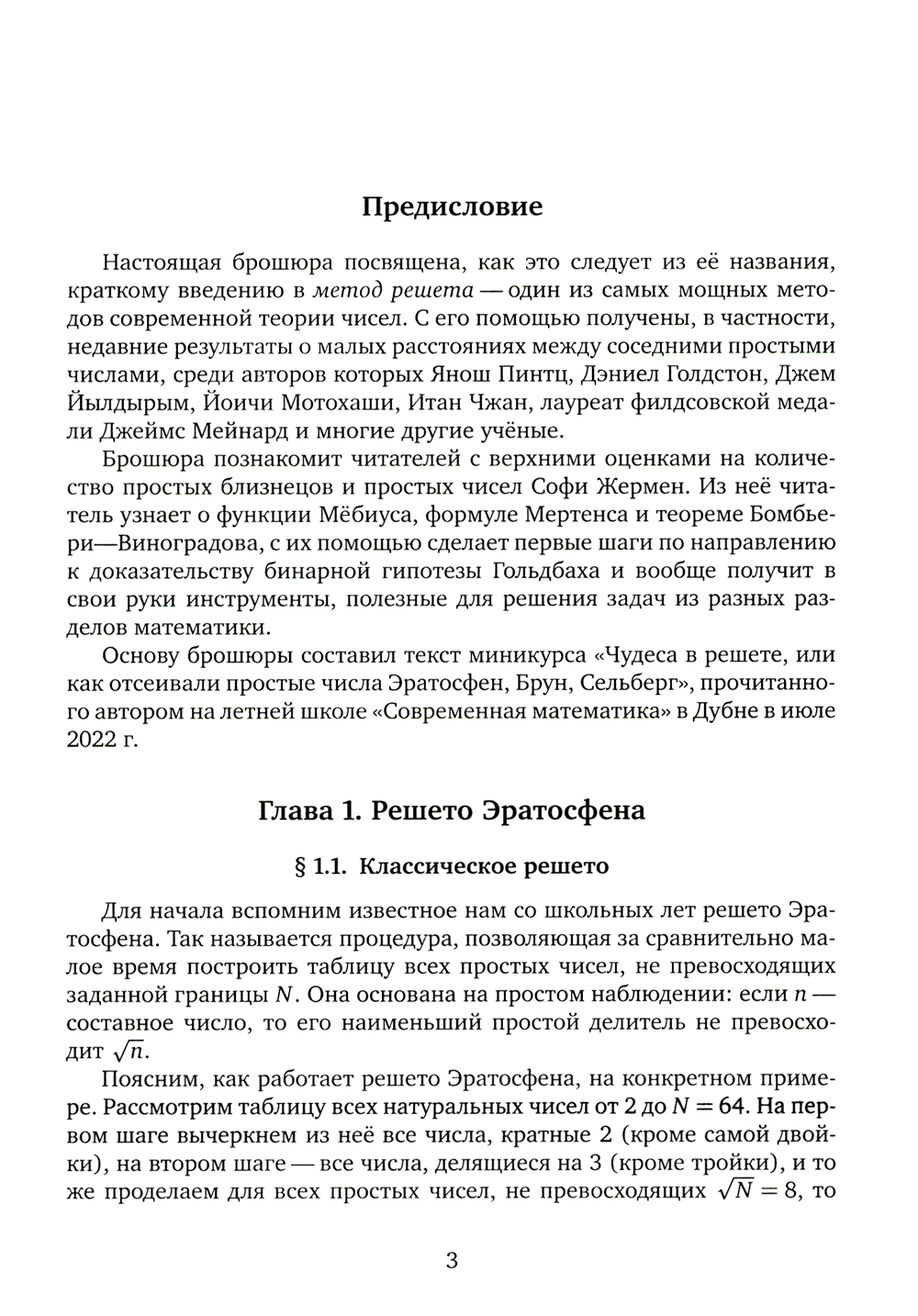 Брошюра посвящена краткому введению в метод решета - один из самых мощных методов современной теории чисел. Она познакомит читателей с верхними оценками на количество простых близнецов и простых чисел Софи Жермен. Из неё читатель узнает о функции Мёбиуса, формуле Мертенса и теореме Бомбьери-Виноградова и с их помощью сделает первые шаги по направлению к доказательству бинарной гипотезы Гольдбаха. Брошюра основана на миникурсе, прочитанном автором на летней школе «Современная математика» в Дубне в июле 2022 г.| Издательство | МЦНМО |