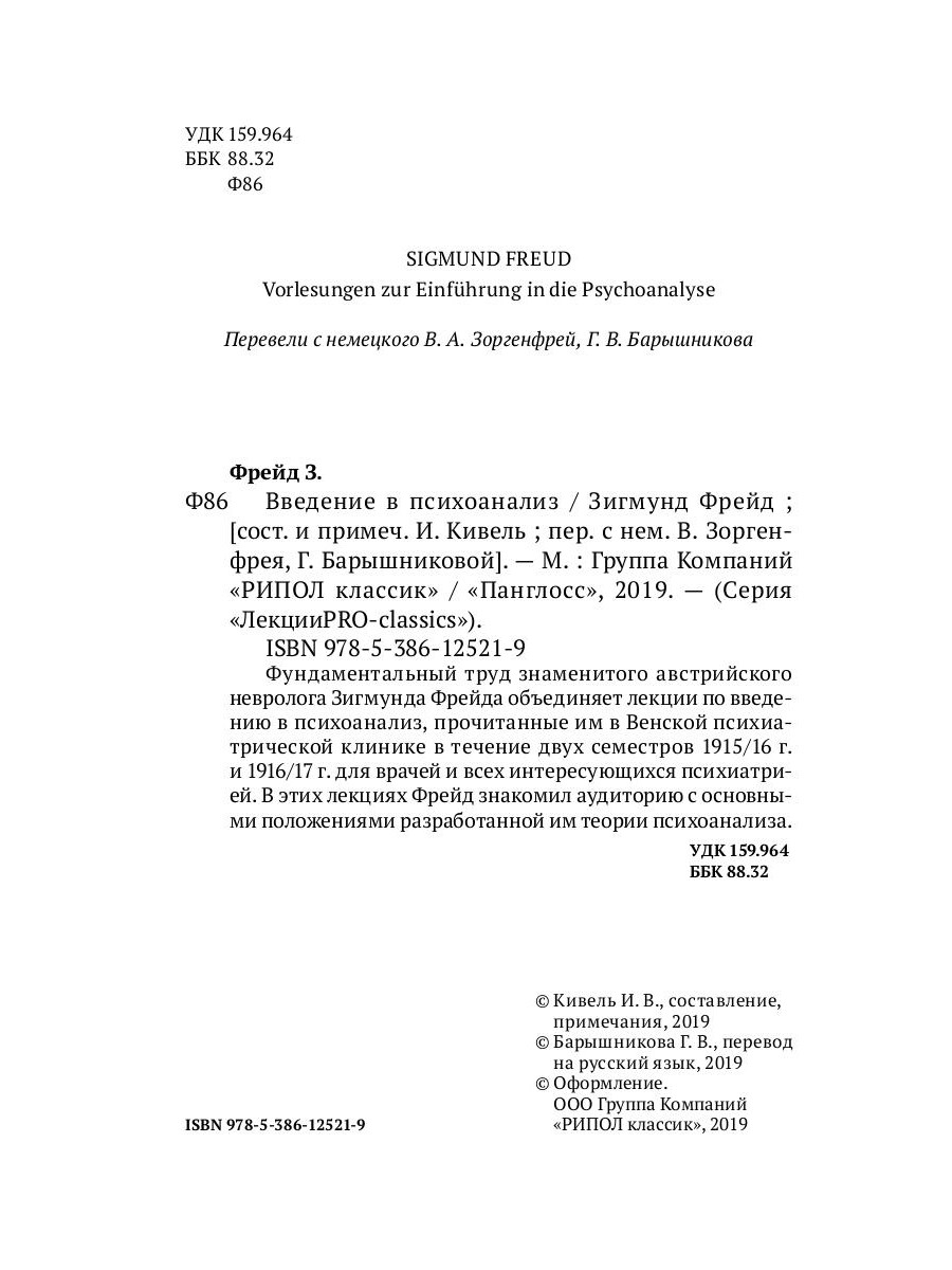 Фундаментальный труд знаменитого австрийского невролога Зигмунда Фрейда объединяет лекции по введению в психоанализ, прочитанные им в Венской психиатрической клинике в течение двух семестров 1915/16 г. и 1916/17 г. для врачей и всех интересующихся психиатри ей. В этих лекциях Фрейд знакомил аудиторию с основными положениями разработанной им теории психоанализа.| Издательство | Рипол Классик |