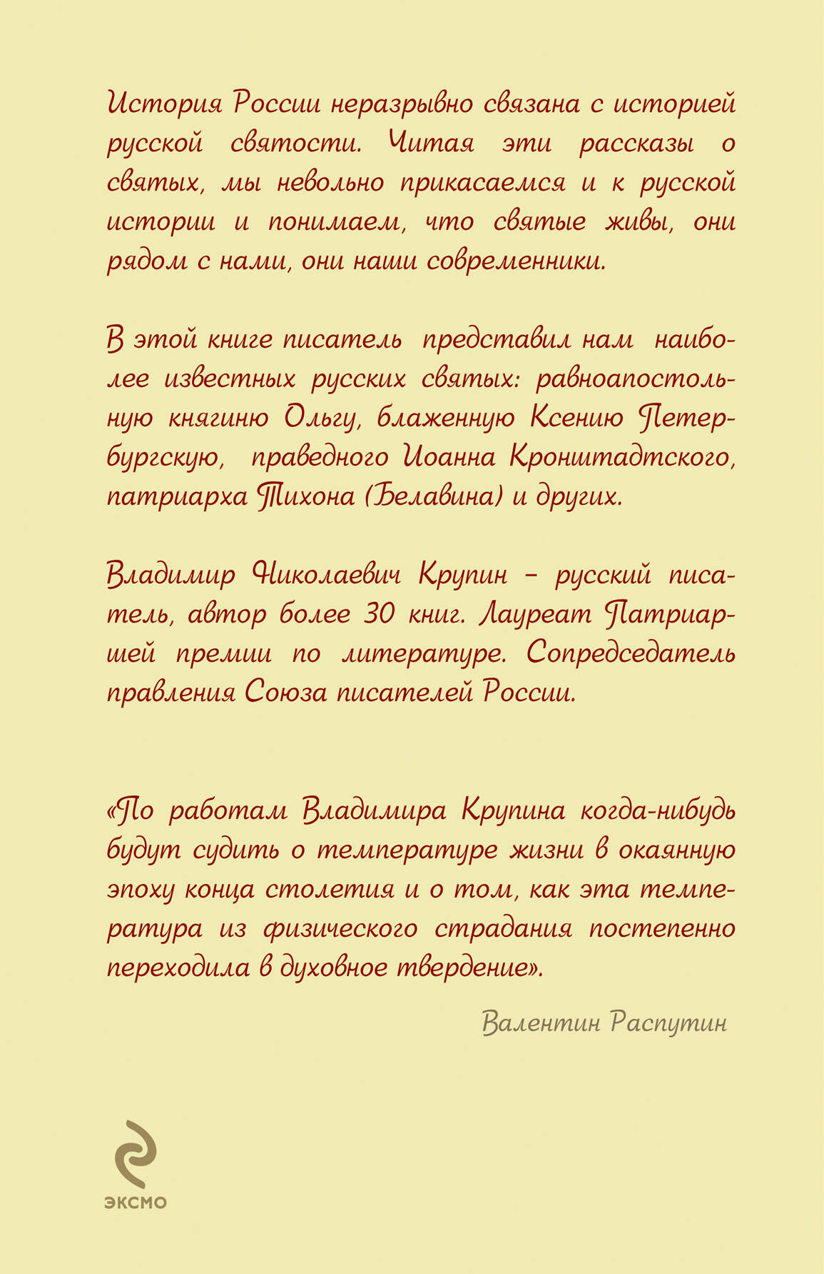 Читая эти рассказы о святых, мы невольно прикасаемся и к русской истории и понимаем, что святые живы, они рядом с нами, они наши современники и наши хранители: равноапостольная княгиня Ольга, блаженная Ксения Петербургская, праведный Иоанн Кронштадтский, патриарх Тихона (Белавин) и многие другие. Владимир Николаевич Крупин - русский писатель, автор более 30 книг. Лауреат Патриаршей премии по литературе. Cопредседатель правления Союза писателей России. Книга допущена к распространению Издательским Советом Русской Православной Церкви.| Издательство | ООО "Издательство "Эксмо" |
