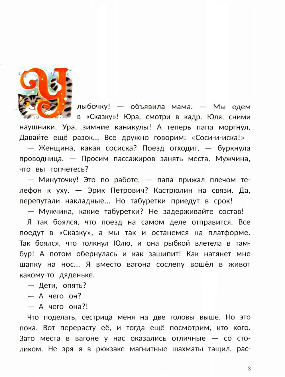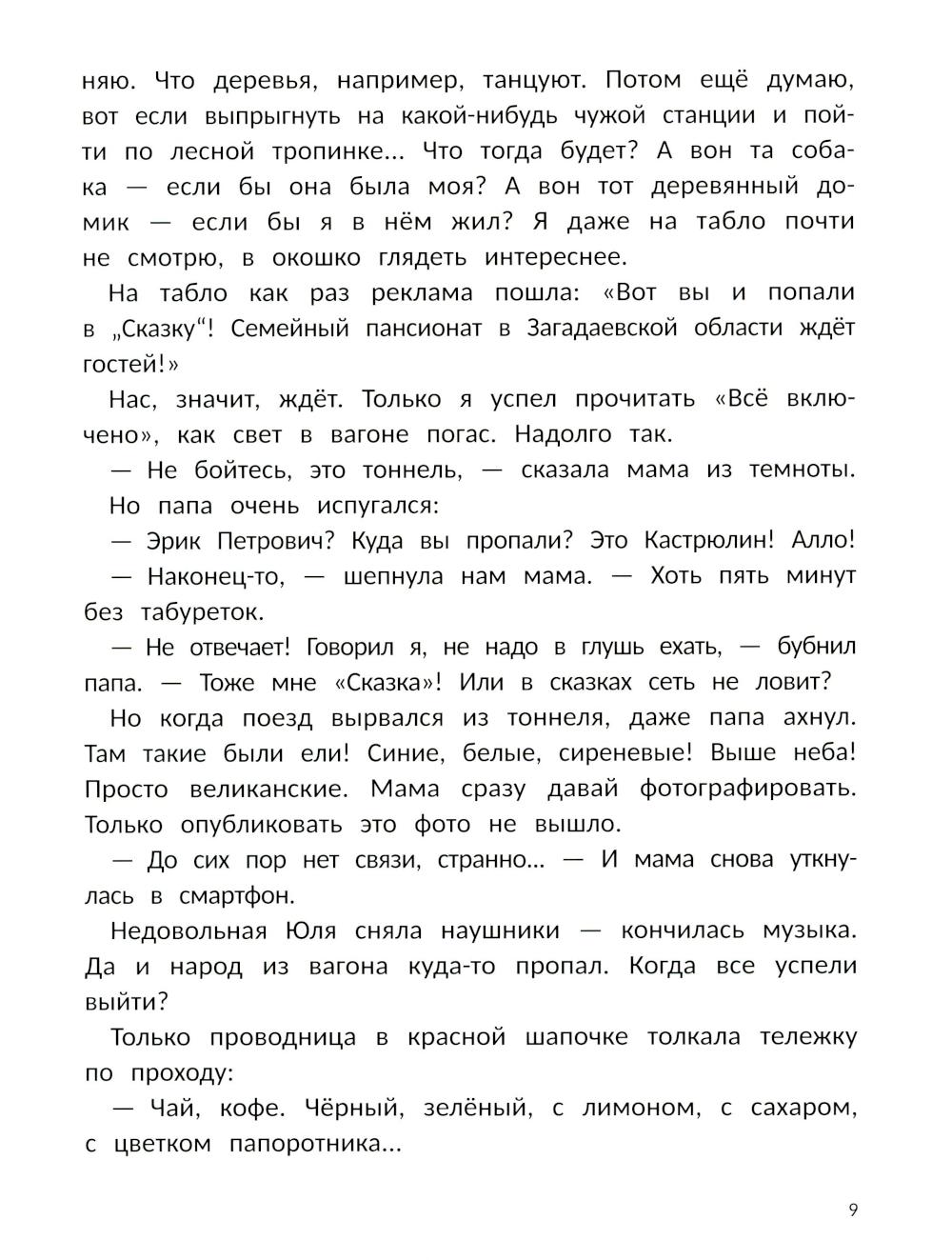 «Сказка» оборачивается настоящим приключением - поезд внезапно увозит семью Кастрюлиных в настоящую сказку. Здесь короли убирают снег, гномы разъезжают на телегах, запряжённых единорогами, а в номере отеля поселился... людоед. Но самое страшное здесь - это не чудища, а отсутствие интернета! Смогут ли папа, мама, Юля и Юра вернуться домой? И захотят ли?| Издательство | Феникс |