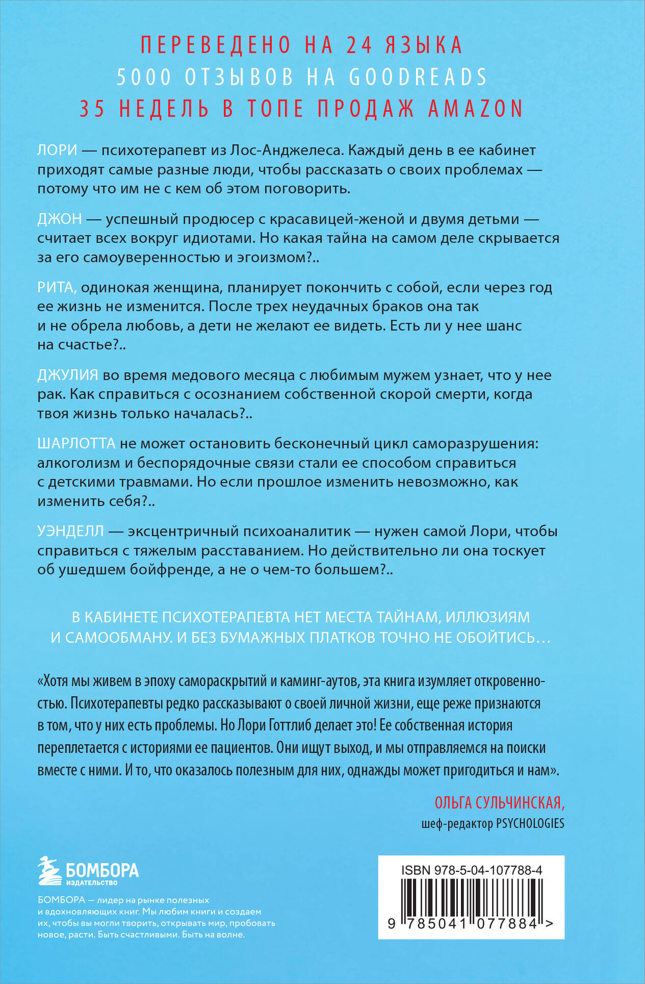 Невероятно искренние и поразительно откровенные мемуары психотерапевта, покорившие мир. О книге с восторгом отзываются Арианна Хаффингтон, Сьюзан Кейн и Ирвин Ялом. Лори - психотерапевт из Лос-Анджелеса. Каждый день в ее кабинет приходят самые разные люди, чтобы рассказать о своих проблемах - потому что им не с кем об этом поговорить. Джон - успешный продюсер с красавицей-женой и двумя детьми - уверен, что все вокруг идиоты. Но какая тайна на самом деле скрывается за его самоуверенностью и эгоизмом?.. Рита, одинокая женщина, планирует покончить с собой, если через год ее жизнь не изменится. После трех неудачных браков она так и не обрела любовь, а дети не желают ее видеть. Есть ли у нее шанс на счастье?.. Джулия во время медового месяца с любимым мужем узнает, что у нее рак. Как справиться с осознанием собственной скорой смерти, когда твоя жизнь только началась?.. Шарлотта не может остановить бесконечный цикл саморазрушения: алкоголизм и беспорядочные связи стали ее способом справиться с детскими травмами. Но если прошлое изменить невозможно, как изменить себя?.. Уэнделл - эксцентричный психоаналитик - нужен самой Лори, чтобы справиться с тяжелым расставанием. Но действительно ли она тоскует об ушедшем бойфренде, а не о чем-то большем?.. В кабинете психотерапевта нет места тайнам, иллюзиям и самообману. И без бумажных платков точно не обойтись…| Издательство | ООО "Издательство "Эксмо" |