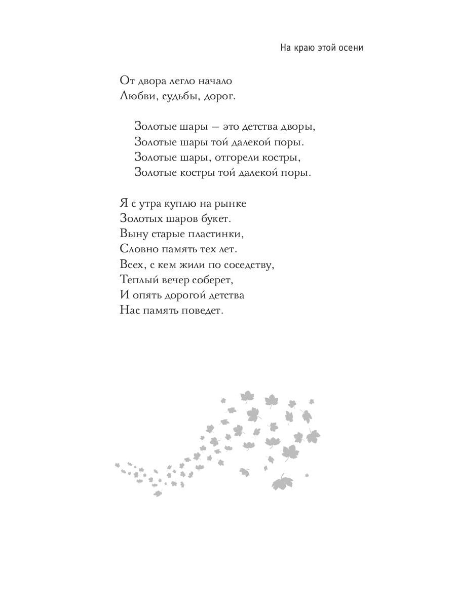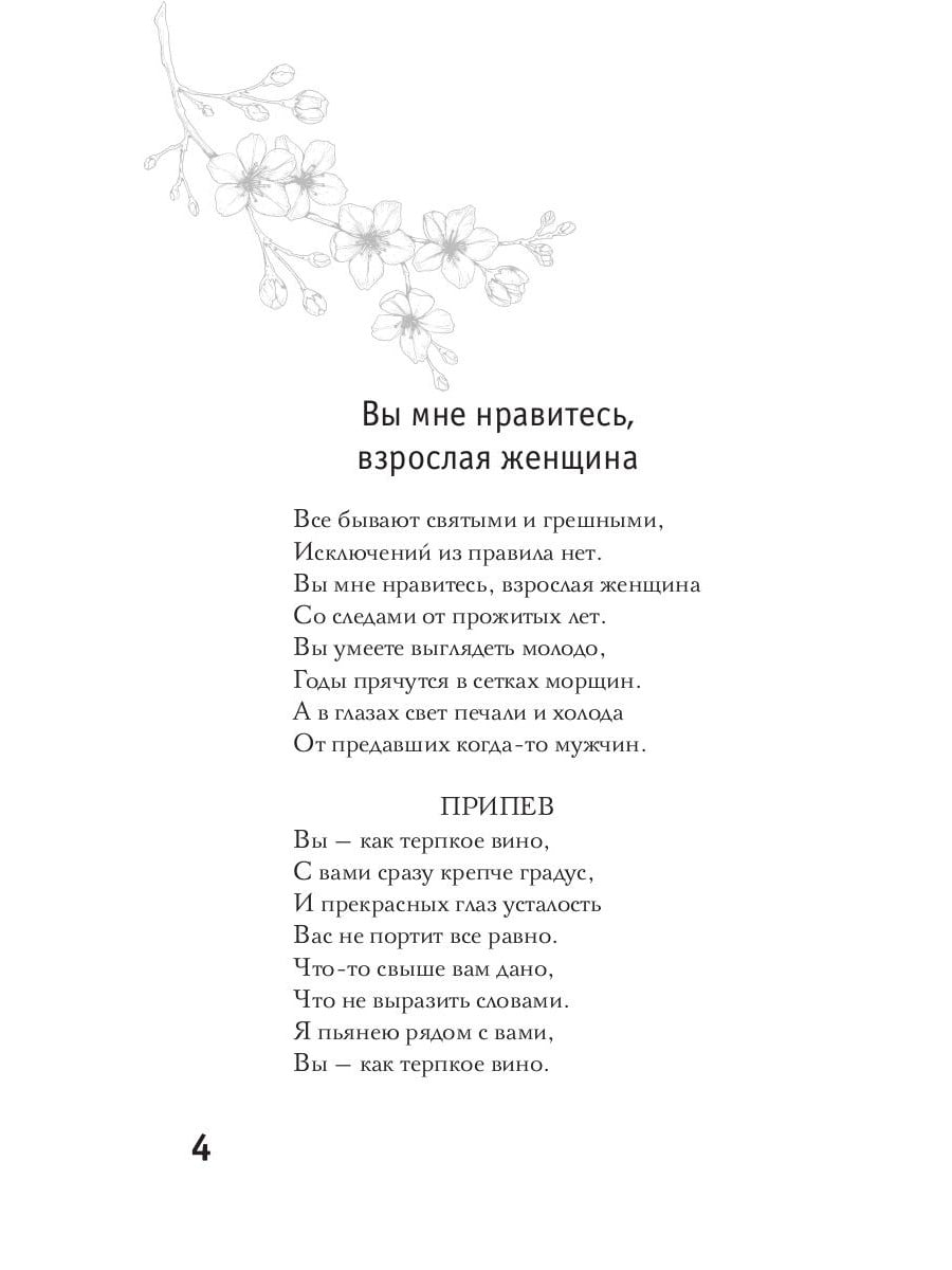 Лариса Рубальская пишет, прежде всего, о любви - счастливой и часто не очень. А о чем еще писать, ведь любовь - созидающее чувство и в любое время года окрыляет. Финал же старается придумать такой, чтобы даже в самых, казалось бы, неразрешимых ситуациях всегда оставалась надежда. Осенью 2022 года, когда собрали новые осенние стихотворения того же времени в книге «На краю осени», настроение было совсем осенним. Но ведь невозможно все время находиться на краю осени. Меняется настроение, да и время года. И книга «На краю осени» переросла саму себя, превратившись в новый, более полный сборник «Вы мне нравитесь, взрослая женщина», а новые стихотворения, «Мелодии весны» и песни к новому водевилю «Секрет Полишинеля» привнесли большую долю оптимизма в этот новый сборник. В книгу включены новые и лучшие стихи, в том числе новое стихотворение «Вы мне нравитесь, взрослая женщина», а также новые песни к мюзиклу «Золотой гусь» по мотивам одноименной сказки братьев Гримм, мюзиклу «Одна из многих» по повести Виктории Токаревой, сериалу «Арбатские тайны» и совсем новые, впервые публикуемые, песни к водевилю «Секрет Полишинеля» и автобиографический рассказ «Сверкащий камень».| Издательство | Рипол Классик |
