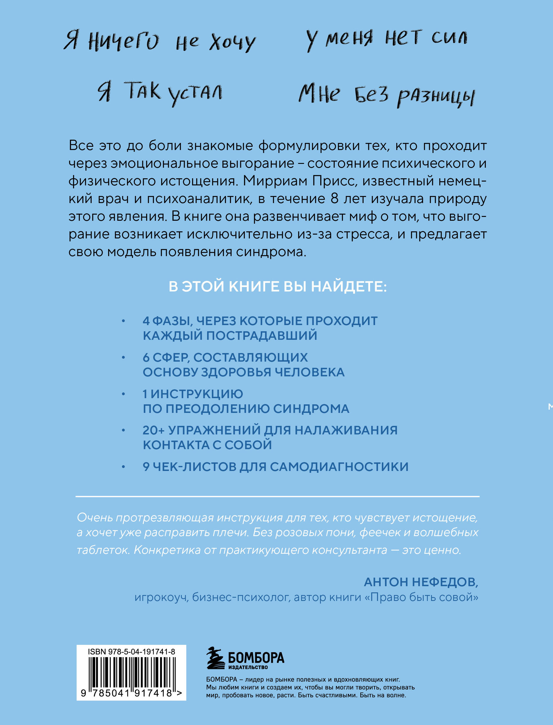 «Я ничего не хочу», «У меня нет сил», «Я так устал», «Мне без разницы» Все это до боли знакомые формулировки тех, кто проходит через эмоциональное выгорание - состояние психического и физического истощения. Мириам Присс, известный немецкий врач и психоаналитик, в течение 8 лет изучала природу этого явления. В этой книге она развенчивает миф о том, что выгорание возникает исключительно из-за стресса, и предлагает свою модель появления синдрома. В этой книге вы найдете: - 4 фазы, через которые проходит каждый пострадавший; - 6 сфер, составляющих основу здоровья человека; - 1 инструкцию по преодолению синдрома; - 20+ упражнений для налаживания контакта с собой; - 9 чек-листов для самодиагностики.| Издательство | ООО "Издательство "Эксмо" |