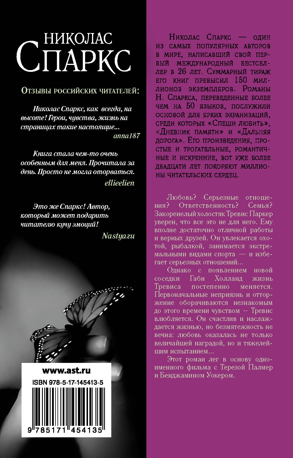 Любовь? Серьезные отношения? Ответственность? Семья? Закоренелый холостяк Тревис Паркер уверен, что все это не для него. Ему вполне достаточно отличной работы и верных друзей. Он увлекается охотой, рыбалкой, занимается экстремальными видами спорта - и избегает серьезных отношений... Однако с появлением новой соседки Габи Холланд жизнь Тревиса постепенно меняется. Первоначальные неприязнь и отторжение оборачиваются незнакомым до этого времени чувством - Тревис влюбляется. Он счастлив и наслаждается жизнью, но безмятежность не вечна: любовь оказалась не только величайшей наградой, но и тяжелейшим испытанием... Этот роман лег в основу одноименного фильма с Терезой Палмер и Бенджамином Уокером.| Издательство | ИЗДАТЕЛЬСТВО "АСТ" |