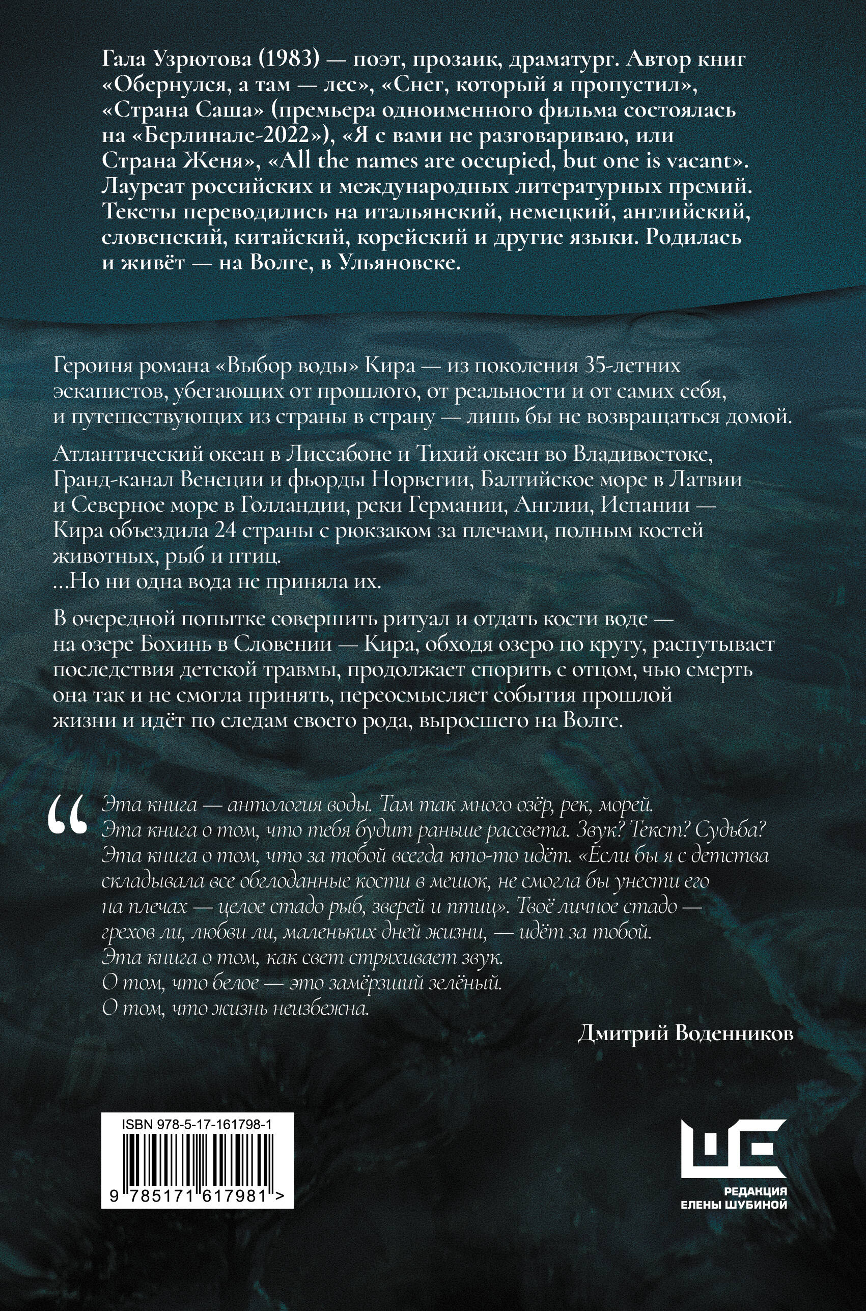 В «Редакции Елены Шубиной» выходит атмосферный и мистичный роман Галы Узрютовой «Выбор воды». Тонкая поэтичная проза, в которой вода - главное действующее лицо. Это история о Кире и ее практически ритуальном перемещении по большой воде с удивительной задачей - отдать воде кости всех некогда съеденных ею животных. Антология воды: Атлантический океан в Лиссабоне и Тихий океан во Владивостоке, Гранд-канал Венеции и фьорды Норвегии, реки и озёра… Ни одна вода не приняла их. Поход вокруг озера Бохинь - очередная попытка Киры. Она уверена, что быстро обойдёт Бохинь, совершит ритуал, и всё закончится. Но у озера - свои планы. В каждом новом месте Кира оставляет камень со своим номером телефона, и на озере Бохинь она впервые получает ответ от нашедшего камень; представившийся Эвереттом незнакомец будто бы идёт по её следам, и - внезапно - подозрительно много знает о самой Кире… Но кто это - случайный турист, или сталкер, который вот-вот превратит философскую притчу в психологический триллер, читатель не узнает, пока не обойдет озеро Бохинь вместе с Кирой.