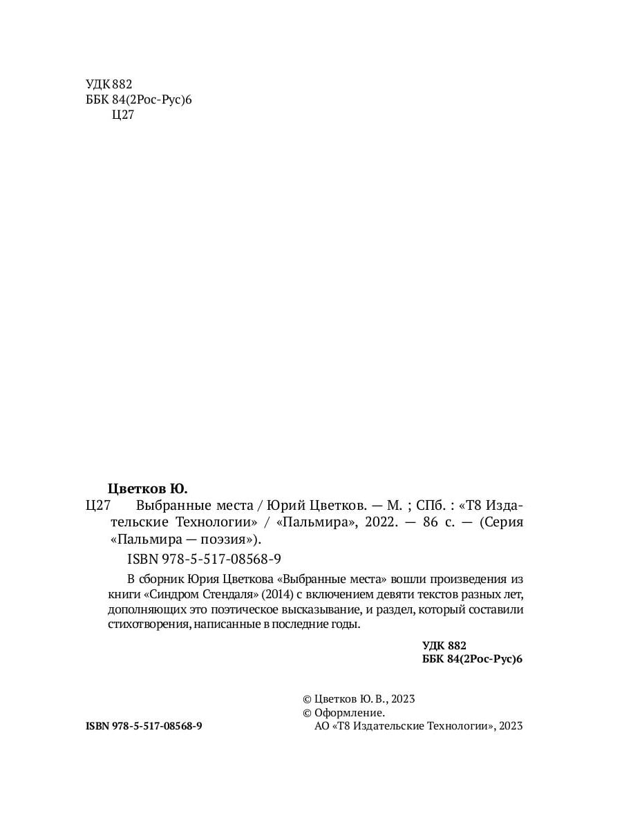 В сборник Юрия Цветкова "Выбранные места" вошли произведения из книги "Синдром Стендаля" (2014) с включением девяти текстов разных лет, дополняющих это поэтическое высказывание, и раздел, который составили стихотворения, написанные в последние годы.