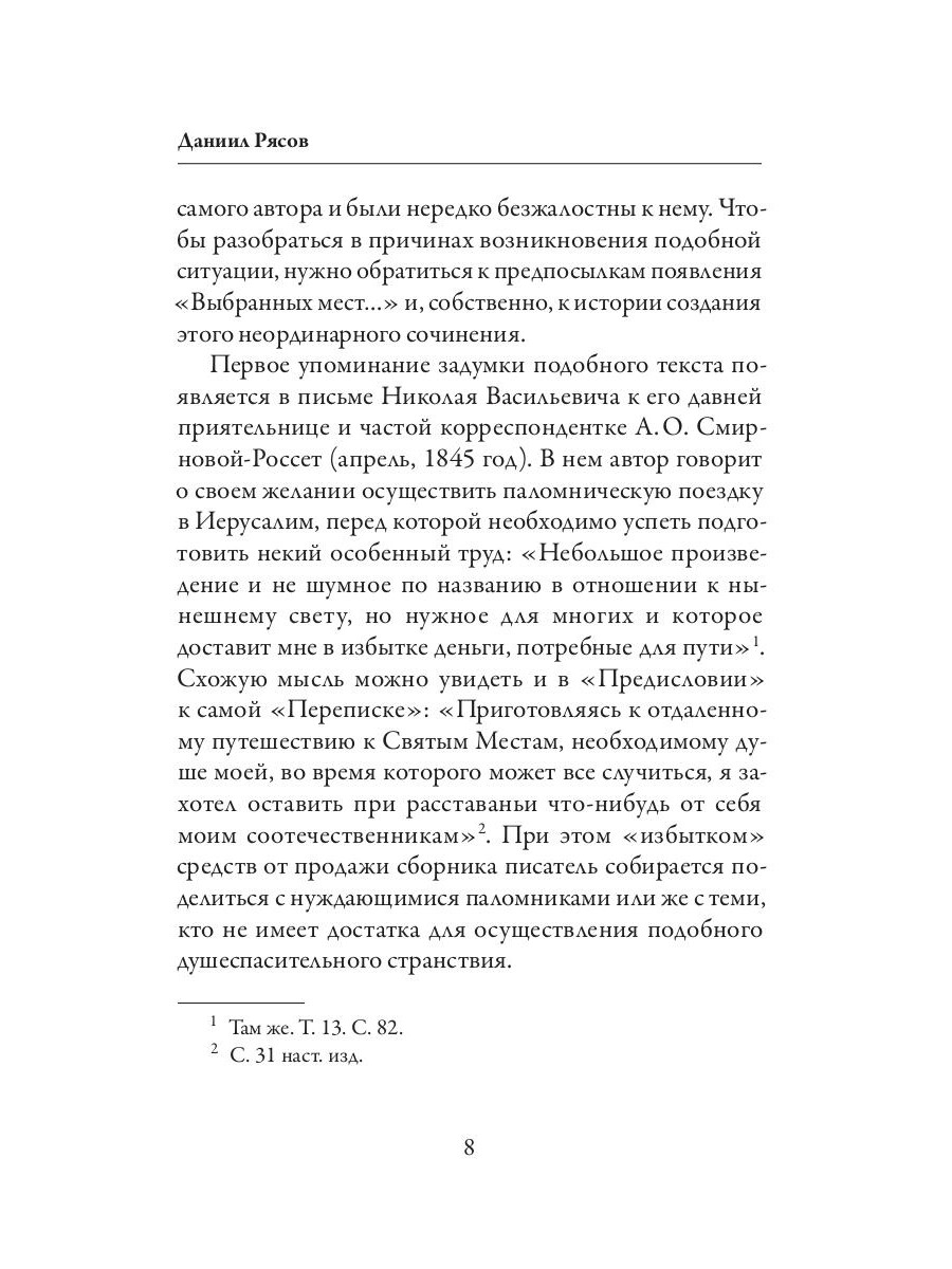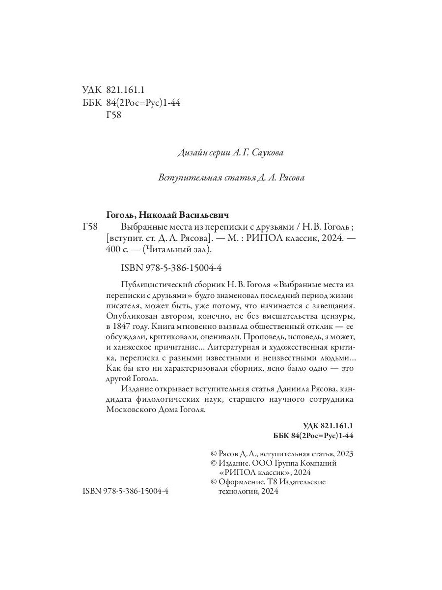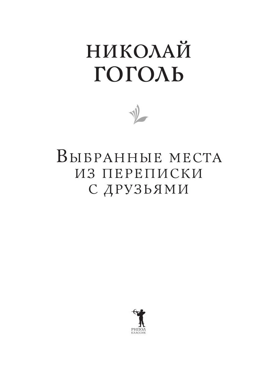 Публицистический сборник Н. В. Гоголя «Выбранные места из переписки с друзьями» будто знаменовал последний период жизни писателя, может хотя бы потому, что начинается с завещания. Опубликован автором, конечно не без цензуры, в 1847 году. Книга мгновенно вызвала общественный отклик - ее обсуждали, критиковали, оценивали. Проповедь и исповедь, а может, и ханжеское причитание?.. Литературная и художественная критика, актуальная переписка с разными известными и неизвестными людьми?.. Как бы ни характеризовали сборник, ясно было одно - это другой Гоголь. Издание отерывает вступительная статья Даниила Рясова, кандидата филологических наук, старшего научного сотрудника Московского Дома Гоголя.| Издательство | Рипол Классик |