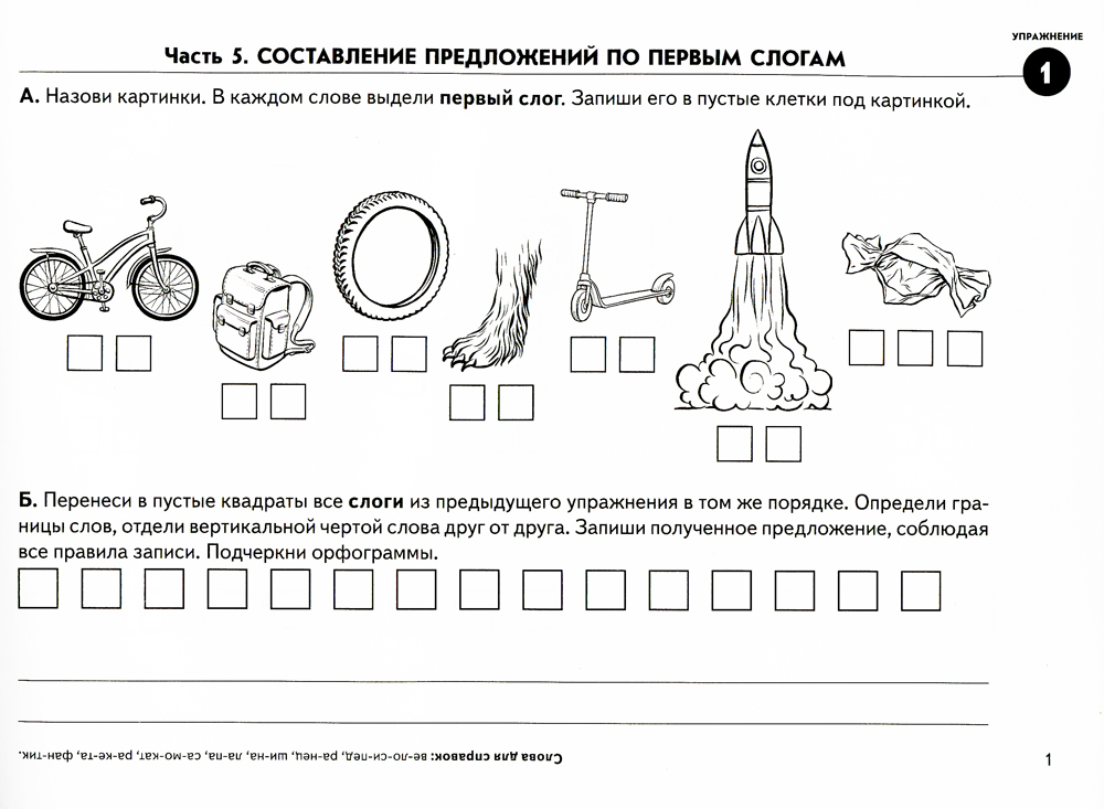 Цель данного альбома - развитие фонематических процессов у младших школьников, обучение детей полноценному звукобуквенному и слоговому анализу и синтезу слов, развитие внимания, памяти и мышления. Для этого ребенку необходимо расшифровать предложение: выделить из ряда слов - названий картинок заданные звуки или слоги, записать их буквами в ряд, а затем разделить его на слова и записать получившееся предложение с учетом правил русского языка.