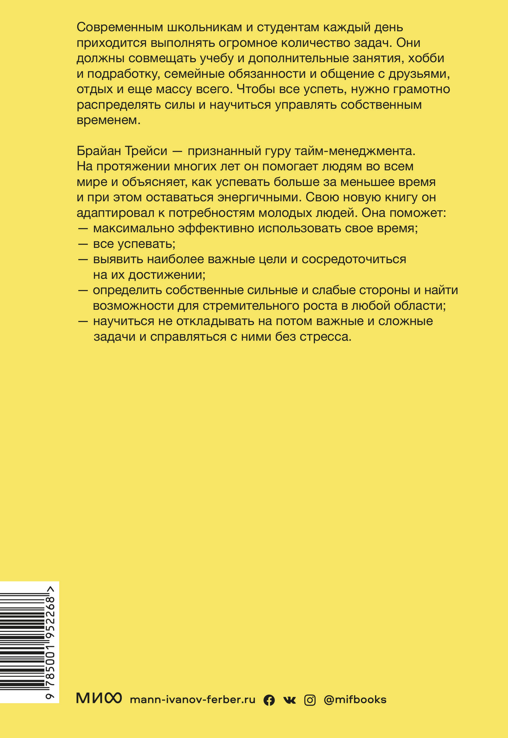 Книга по мотивам международного бестселлера Брайана Трейси "Выйди из зоны комфорта", адаптированная для подростков. Поможет грамотно распределить силы, научиться управлять временем и справиться со стрессом, возникающим на фоне высоких нагрузок. Этими навыками школьники и студенты смогут пользоваться в течение всей жизни. Современные молодые люди должны осваивать не только школьную (или вузовскую) программу, но и навыки тайм-менеджмента. Ведь им приходится совмещать учебу, дополнительные занятия, работу, стажировку, хобби, спорт, семейные обязанности и многое другое. Брайан Трейси - признанный гуру тайм-менеджмента. На протяжении многих лет он помогает людям управлять своим временем, объясняя, как успевать больше за меньшее время. Свою новую книгу он адаптировал к потребностям молодых людей. Трейси дает советы, инструменты и методы, которые помогут структурировать время, грамотно ставить цели, выполнять задачу (даже если она не кажется интересной), справляться со стрессом и развивать навыки для достижения высоких результатов. Книга, о которой мечтали родители и педагоги. Для кого книга: Для подростков, которые хотят освоить навыки тайм-менеджмента и больше успевать, не уставая. Для каждого родителя, который хочет помочь ребенку управлять временем. Для школьных и вузовских преподавателей. От автора: Эта книга станет поворотным моментом в твоей жизни, независимо от того, когда ты ее прочитаешь - в школе, в вузе или даже после его окончания. Настало время, когда родители все меньше и меньше говорят тебе, что делать, и тебе нужно принимать все больше собственных решений. Ты стоишь на пороге большой и интересной жизни, и выбор возможностей за тобой.| Издательство | Манн, Иванов и Фербер |
