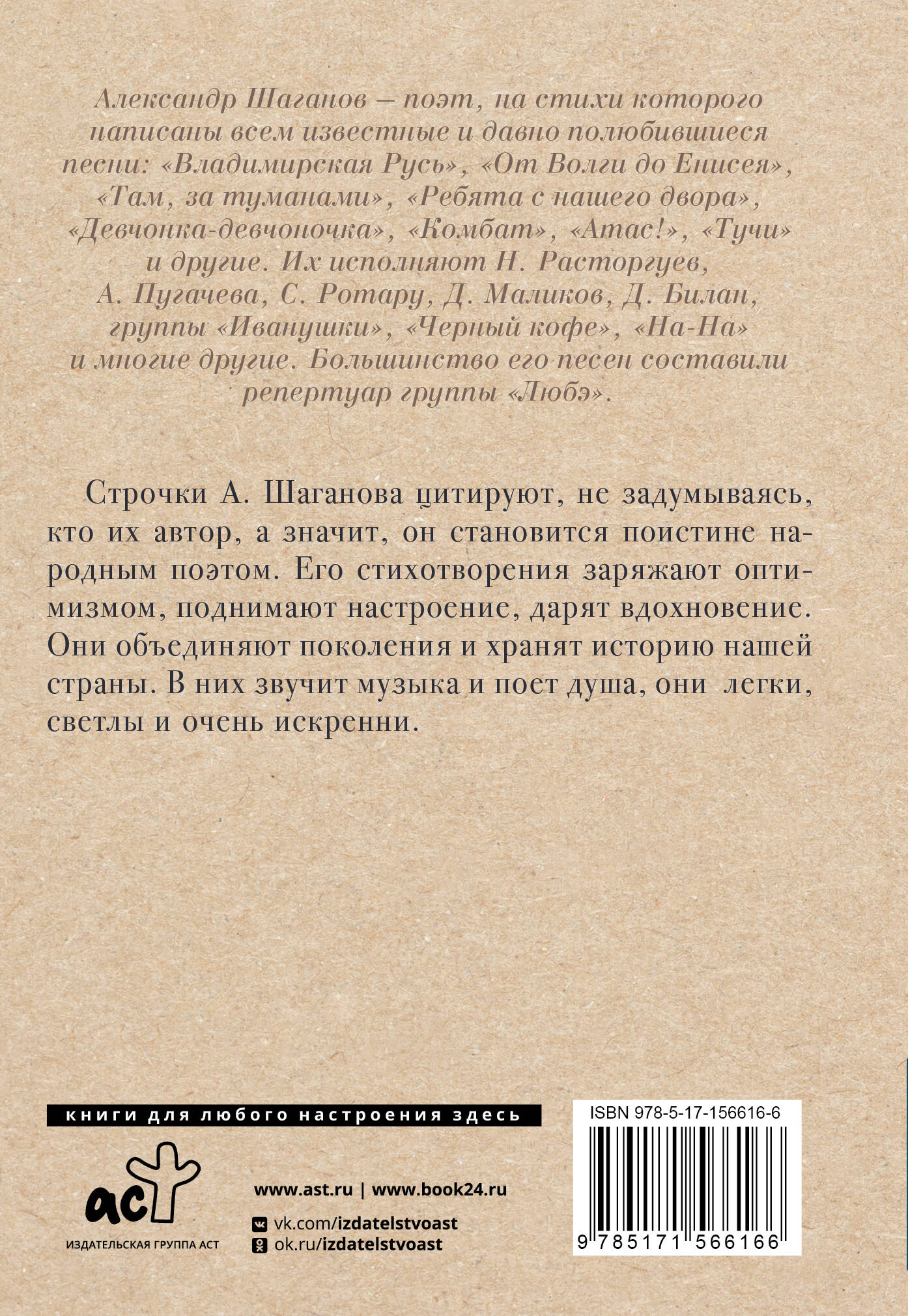 Александр Шаганов - поэт, на стихи которого написаны всем известные и давно полюбившиеся песни: "Владимирская Русь", "От Волги до Енисея", "Там за туманами", "Ребята с нашего двора", "Девчонка-девчоночка", "Комбат", "Атас!", "Тучи" и другие. Их исполняют А. Пугачева, С. Ротару, Д. Маликов, Д. Билан, группы "Иванушки", "Черный кофе", "На-На" и многие другие. Большинство его песен составили репертуар группы "Любэ". Cтрочки А. Шаганова цитируют, не задумываясь, кто их автор, а значит, он становится поистине народным поэтом. Его стихотворения заряжают оптимизмом, поднимают настроение, дарят вдохновение. Они объединяют поколения и хранят историю нашей страны. В них звучит музыка и поет душа, они легки, светлы и очень искренни.| Издательство | Издательство "АСТ" |