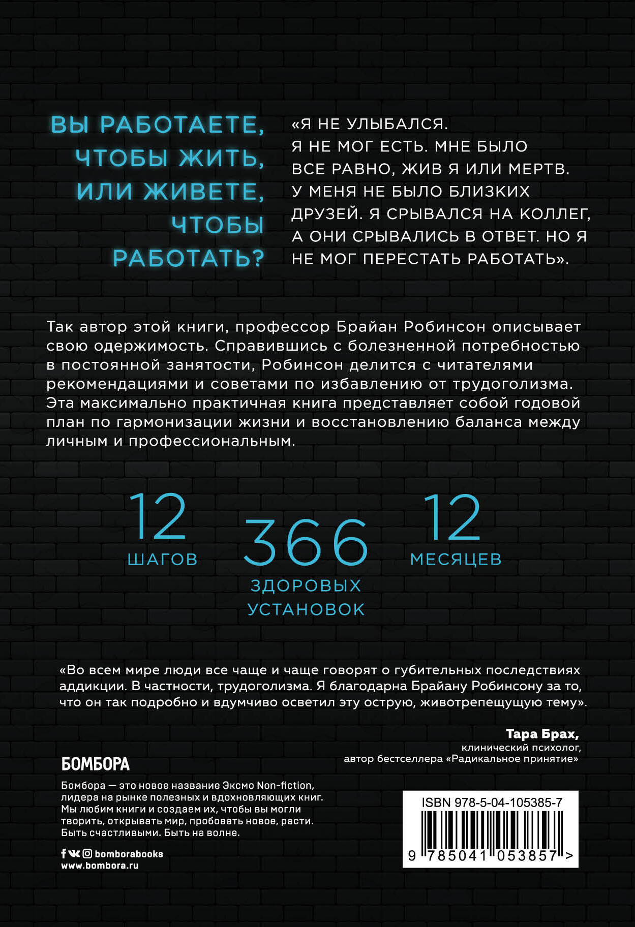 От издательства Как не упустить собственную жизнь, оставаясь эффективным на работе? Профессор Брайан Робинсон посвятил несколько десятилетий изучению проблемы трудоголизма. Будучи сам трудоголиком, начиная еще со средней школы, он в какой-то момент понял, что работа защищала его от нежеланных эмоций и состояний, подобно тому, как в детстве защищала от семейных неурядиц (он вырос в семье алкоголика). Постепенно это привело к тому, что земля стала, образно говоря, уходить у него из-под ног: он не мог улыбаться, не мог есть, его не волновало, жив он или мертв. Справившись с болезненной потребностью в постоянной занятости, Робинсон делится с читателями рекомендациями и советами по избавлению от трудоголизма. Книга Робинсона построена в формате альманаха-календаря, в котором собраны рекомендации для читателей на каждый месяц года. Для начала, советует автор, нужно провести подготовительную работу: выбрать время и задуматься о своих планах, принять собственные недостатки, сократить рабочие планы, избегать многозадачности, постепенно замедлить ритм жизни и т.д. Так, постепенно, автор разбирает каждый месяц в году. Все советы просты и понятны, не требуют каких-либо дополнительных познаний в области психологии. В конце каждой главы сделаны ключевые выводы «за месяц», которые помогут систематизировать прочитанное. В завершении книги приведены 366 фраз-рекомендаций на каждый день года. В заключение автор говорит, что баланс между работой и собственной жизнью - это никогда не прекращающийся процесс, и всего лишь 5 минут «сладкого ничегонеделанья» помогут удержать это равновесие. Почему эта книга достойна прочтения Произведение интересно как оригинальным форматом систематизации и подачи информации, так и тем, что оно написано специалистом-практиком. Спокойный тон повествования, выверенные слова, простые в исполнении советы - все это делает чтение приятным, не отталкивает от книги, действительно побуждает к тому, чтобы пересмотреть свою жизнь. Чувствуется, что произведение написано не дилетантом, а практикующим психологом, который умеет выстроить беседу с пациентом, направить его в нужное русло. Книга «Выключи работу, включи жизнь» будет интересна не только трудоголикам и их близким, но и просто людям, которые страдают от слишком интенсивного рабочего режима и напряженного ритма жизни.| Издательство | ООО "Издательство "Эксмо" |