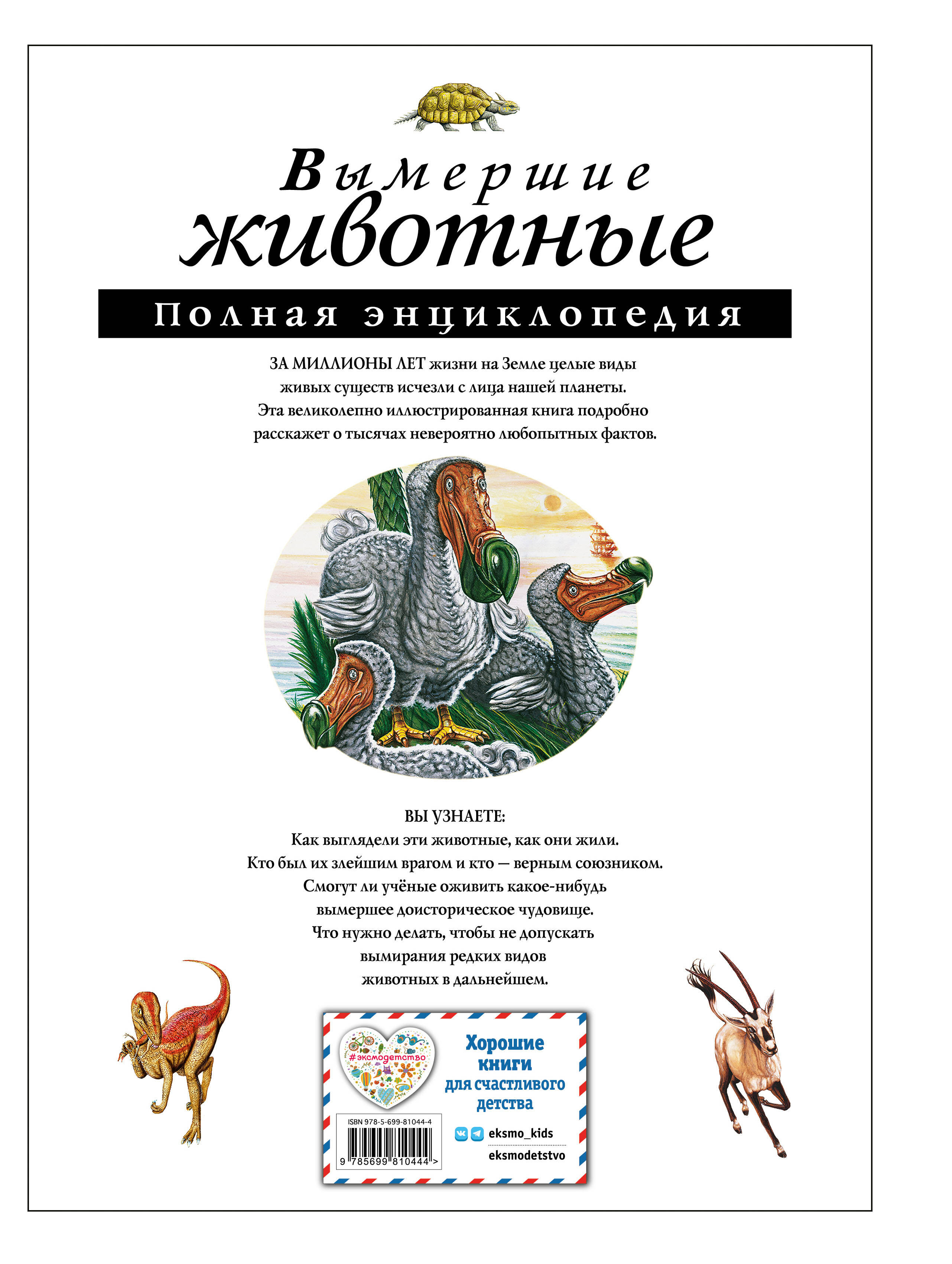 Этих животных нельзя увидеть ни в одном зоопарке мира. Их больше не существует. За миллионы лет жизни на Земле целые виды живых существ исчезли с лица нашей планеты. И понадобились невероятные усилия ученых и удача для натуралистов, чтобы узнать о том, как выглядели вымершие животные. Эта великолепно иллюстрированная книга подробно расскажет о тысячах невероятно любопытных фактов. Вы узнаете: • Как выглядели эти животные, как они жили. • Кто был их злейшим врагом и кто - верным союзником. • Смогут ли ученые оживить какое-нибудь вымершее доисторическое чудовище. • Что нужно делать, чтобы не допускать вымирания редких видов животных в дальнейшем. Рекомендуем эту книгу школьникам, которым она будет полезна на школьных занятиях как дополнительное чтение и справочное пособие.| Издательство | Эксмо |