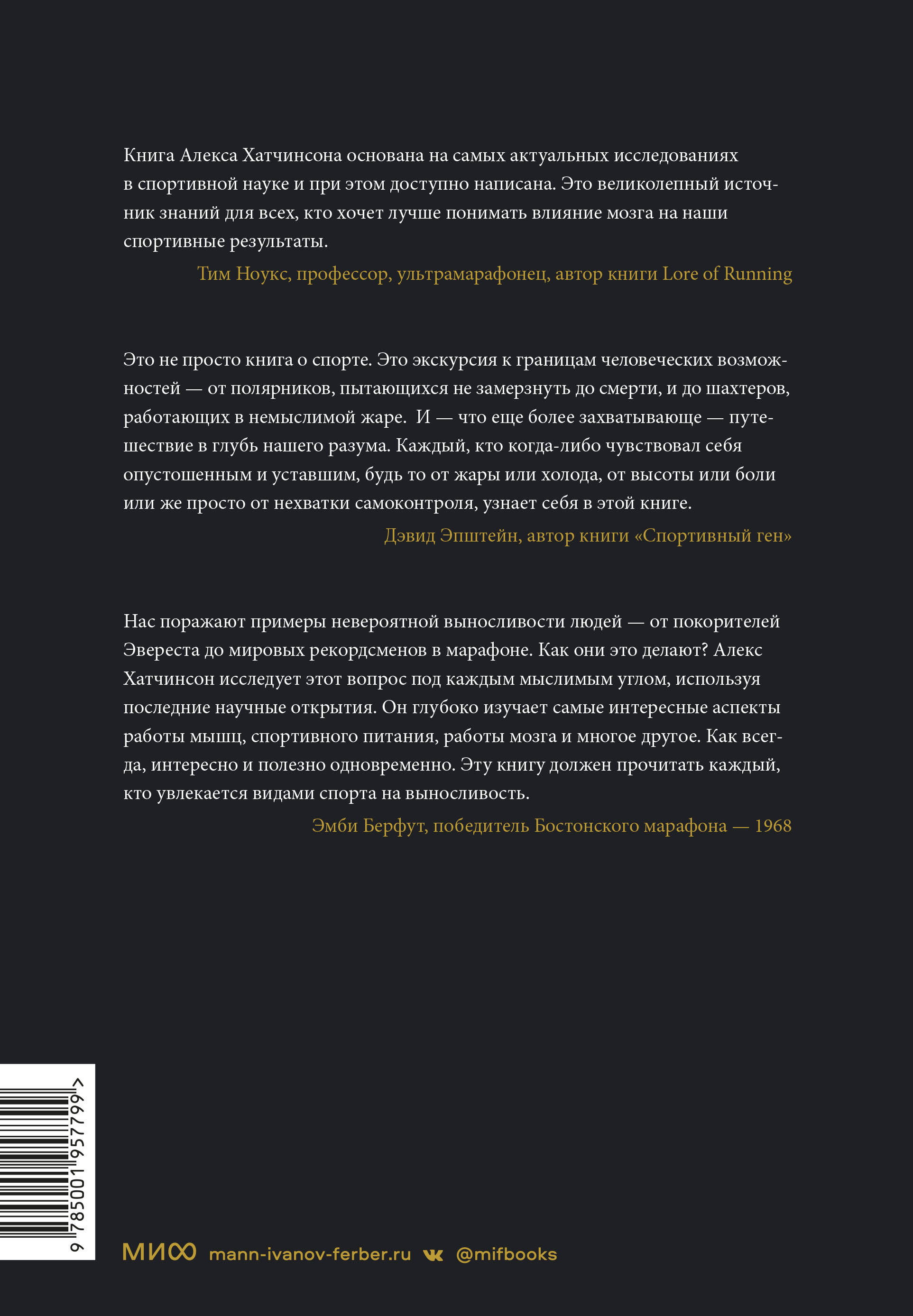 Известный спортивный журналист Алекс Хатчинсон показывает, как связаны наше тело и мозг и как их взаимодействие помогает достигать невозможного.| Издательство | МАНН, ИВАНОВ И ФЕРБЕР ООО |