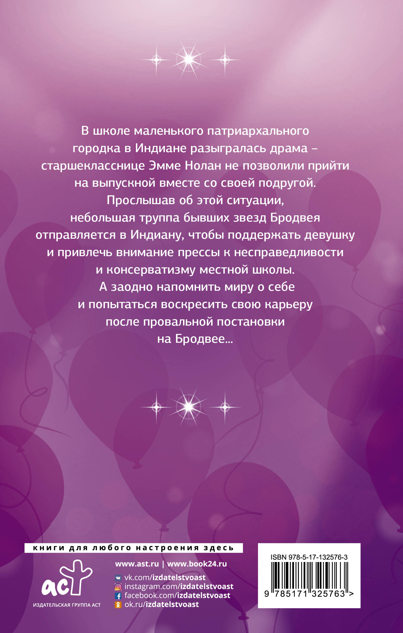 Каждому знакомы школьные драмы: первая любовь, предательство, ошибки. В нашей истории старшекласснице Эмме Нолан не разрешили прийти на выпускной вместе со своей подругой. Что обычно происходит в таких ситуациях? Куча выплаканных слёз и отрешение, но не в этом случае. Поддержать девочек приезжает небольшая трупа бывших звёзд Бродвея. Но цель их заключается не только в помощи ученикам столь консервативной школы...| Издательство | ИЗДАТЕЛЬСТВО "АСТ" |