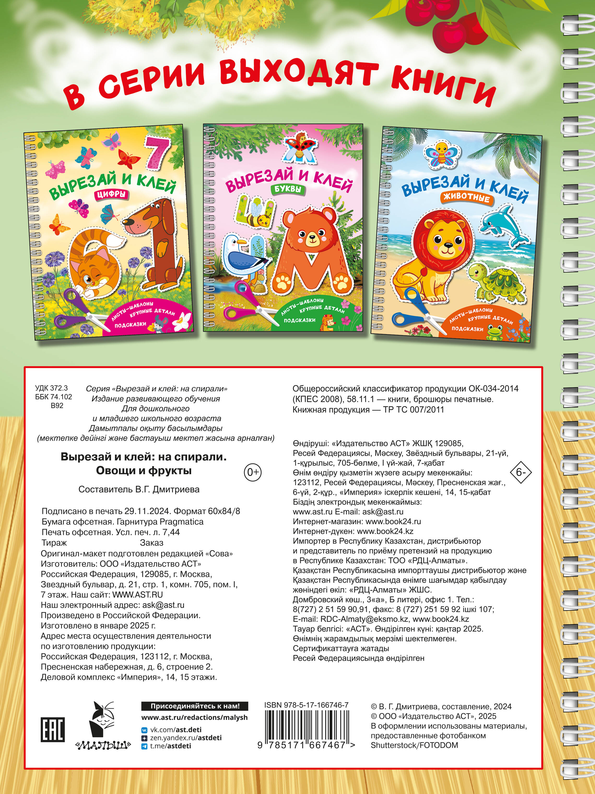 Жужа и Капа рекомендуют! Книга «Вырезай и клей. Овощи и фрукты» - это 32 плотных листа-шаблона на спирали для создания 16 несложных, но прекрасных аппликаций. Чудесные иллюстрации нарисованы профессиональными художниками - все фрукты и овощи выглядят как настоящие. Каждая аппликация состоит из крупных деталей, которые удобно вырезать и клеить как правшам, так и левшам. Ваш малыш может самостоятельно выбрать фон для своего шедевра - с образцами-подсказками или без них. На каждой аппликации есть место для подписи имени и возраста маленького художника - готовые работы малыша можно подарить родным и друзьям, отнести в детский сад на конкурс или повесить в рамке на стену. Все аппликации ребёнок может сделать как вместе с мамой (удовольствие от совместного творчества бесценно), так и самостоятельно. Удобно маме, полезно и доступно ребёнку - то, что надо!