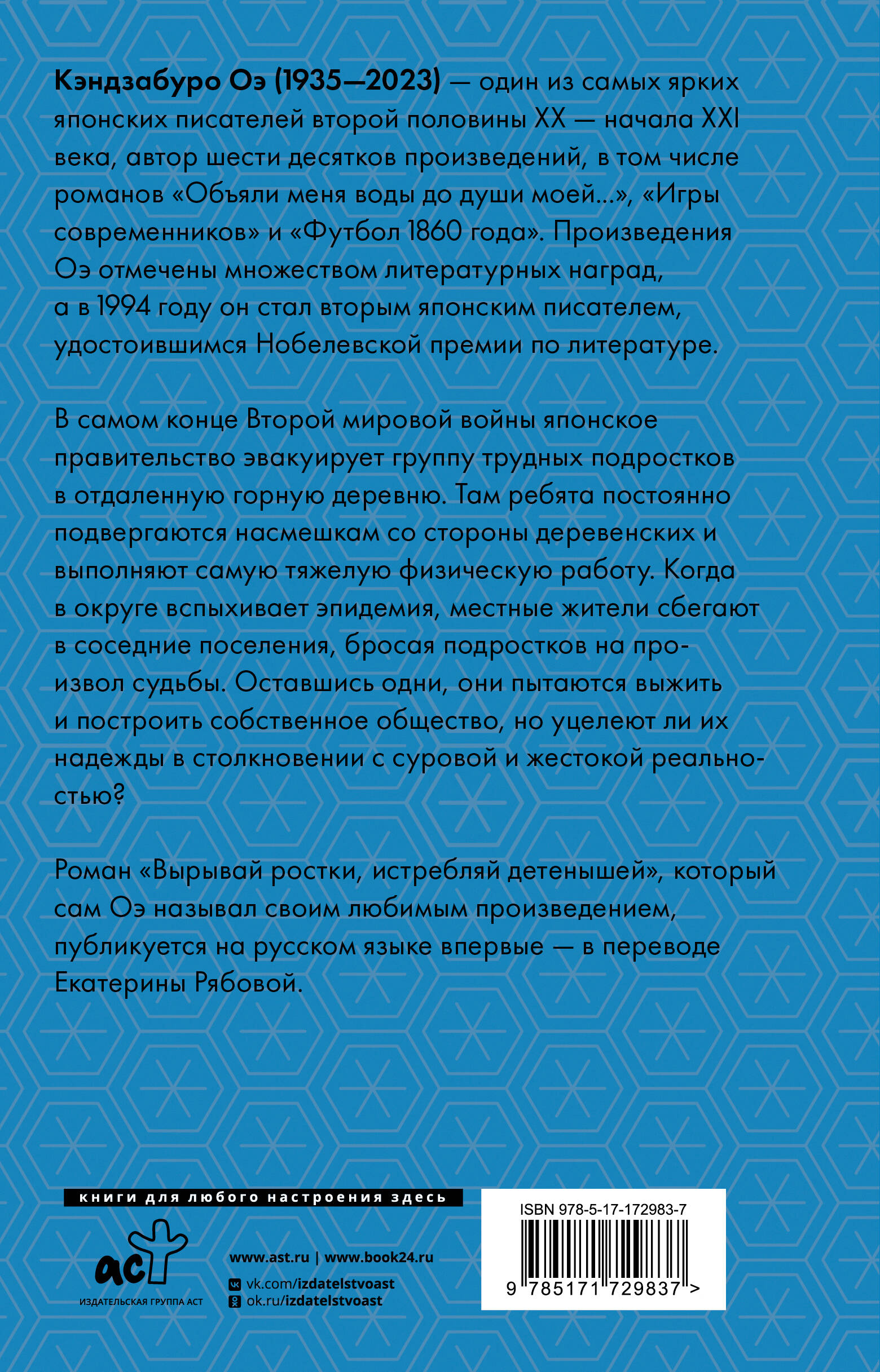 - «Вырывай ростки, истребляй детенышей» - глубокий социально‑психологический роман Кэндзабуро Оэ, японского классика, лауреата Нобелевской премии по литературе. Сам автор называл это произведение своим любимым творением. - Роман публикуется на русском языке впервые в переводе Екатерины Рябовой - уникальная возможность познакомиться с малоизвестным в России шедевром японского классика. - Действие разворачивается в конце Второй мировой войны: группа трудных подростков эвакуирована в отдаленную горную деревню, где им приходится терпеть унижения и выполнять тяжелую работу. Когда в округе вспыхивает эпидемия, местные жители бросают подростков на произвол судьбы - и те пытаются построить собственное общество в условиях суровой реальности. - Кэндзабуро Оэ (1935-2023) - автор шести десятков произведений, второй японский писатель, удостоенный Нобелевской премии по литературе. Его книги отмечены множеством престижных наград, включая премию Дзюнъитиро Танидзаки за роман «Футбол 1960 года». - Роман сочетает исторический контекст (состояние послевоенной Японии), социальную проблематику (исследование отношений между городом и деревней, властью и маргиналами, взрослыми и подростками), философскую и психологическую глубину (в книге поднимаются вопросы морали, выживания и влияния экстремальных условий на формирование личности). - Издание выходит в серии «Neoclassic проза Востока» - на качественной бумаге, с рисунком на форзацах и фольгой на обложке.| Издательство | Издательство "АСТ" |
