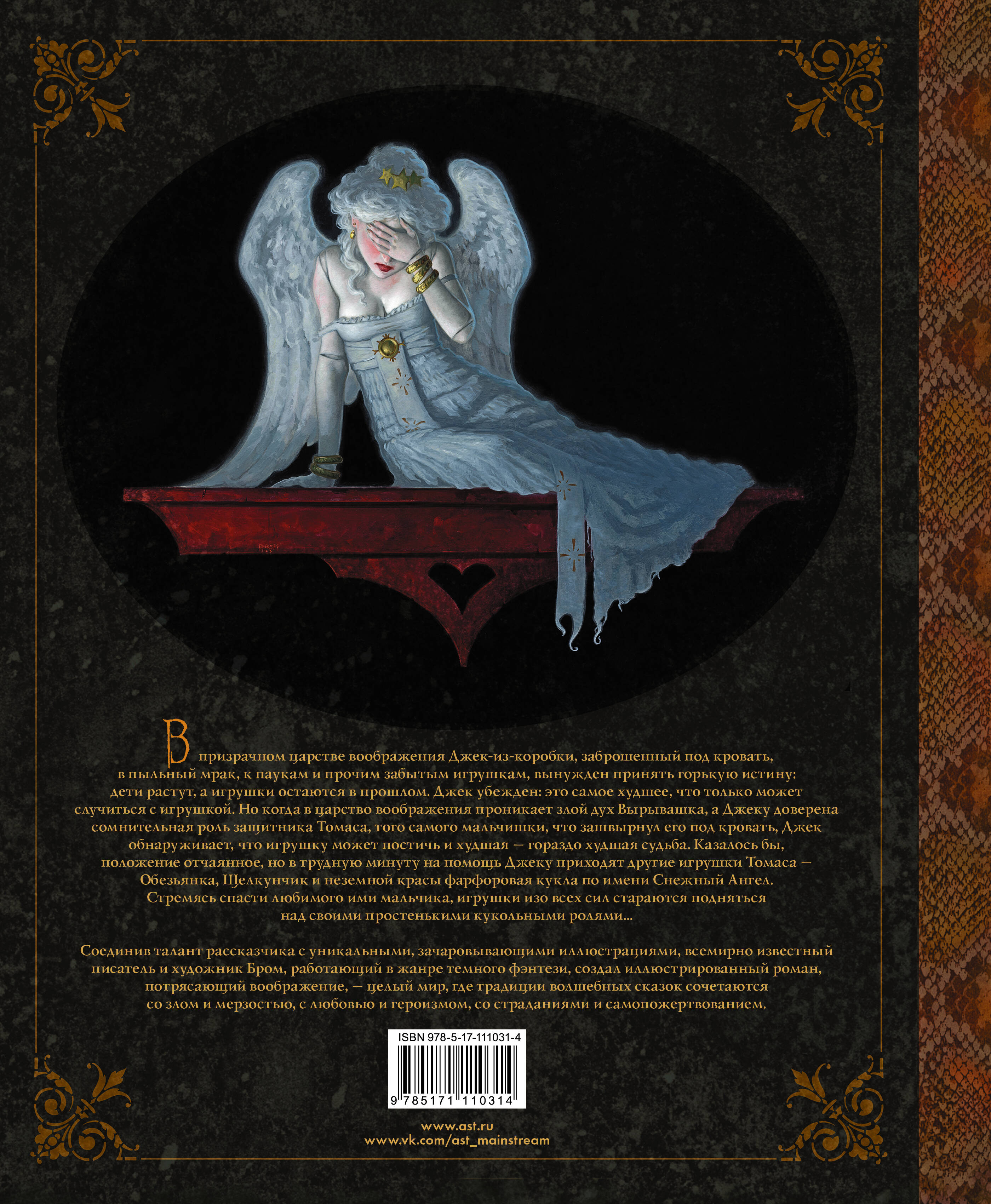 В призрачном царстве воображения Джек-из-коробки, заброшенный под кровать, в пыльный мрак, к паукам и прочим забытым игрушкам, вынужден принять горькую истину: дети растут, а игрушки остаются в прошлом. Джек убежден: это - самое худшее, что только может случиться с игрушкой. Но когда в царство воображения проникает злой дух Вырывашка, а Джеку доверена сомнительная роль защитника Томаса, того самого мальчишки, что зашвырнул его под кровать, Джек обнаруживает, что игрушку может постичь и худшая - гораздо худшая судьба. Казалось бы, положение отчаянное, но в трудную минуту на помощь Джеку приходят другие игрушки Томаса - Обезьянка, Щелкунчик и неземной красы фарфоровая кукла по имени Снежный Ангел. Стремясь спасти любимого ими мальчика, игрушки изо всех сил стараются подняться над своими простенькими кукольными ролями... Соединив талант рассказчика с уникальными зачаровывающими иллюстрациями, всемирно известный писатель и художник Бром, работающий в жанре темного фэнтези, создал иллюстрированный роман, потрясающий воображение - целый мир, где традиции волшебных сказок сочетаются со злом и мерзостью, с любовью и героизмом, со страданиями и самопожертвованием.| Издательство | Издательство "АСТ" |