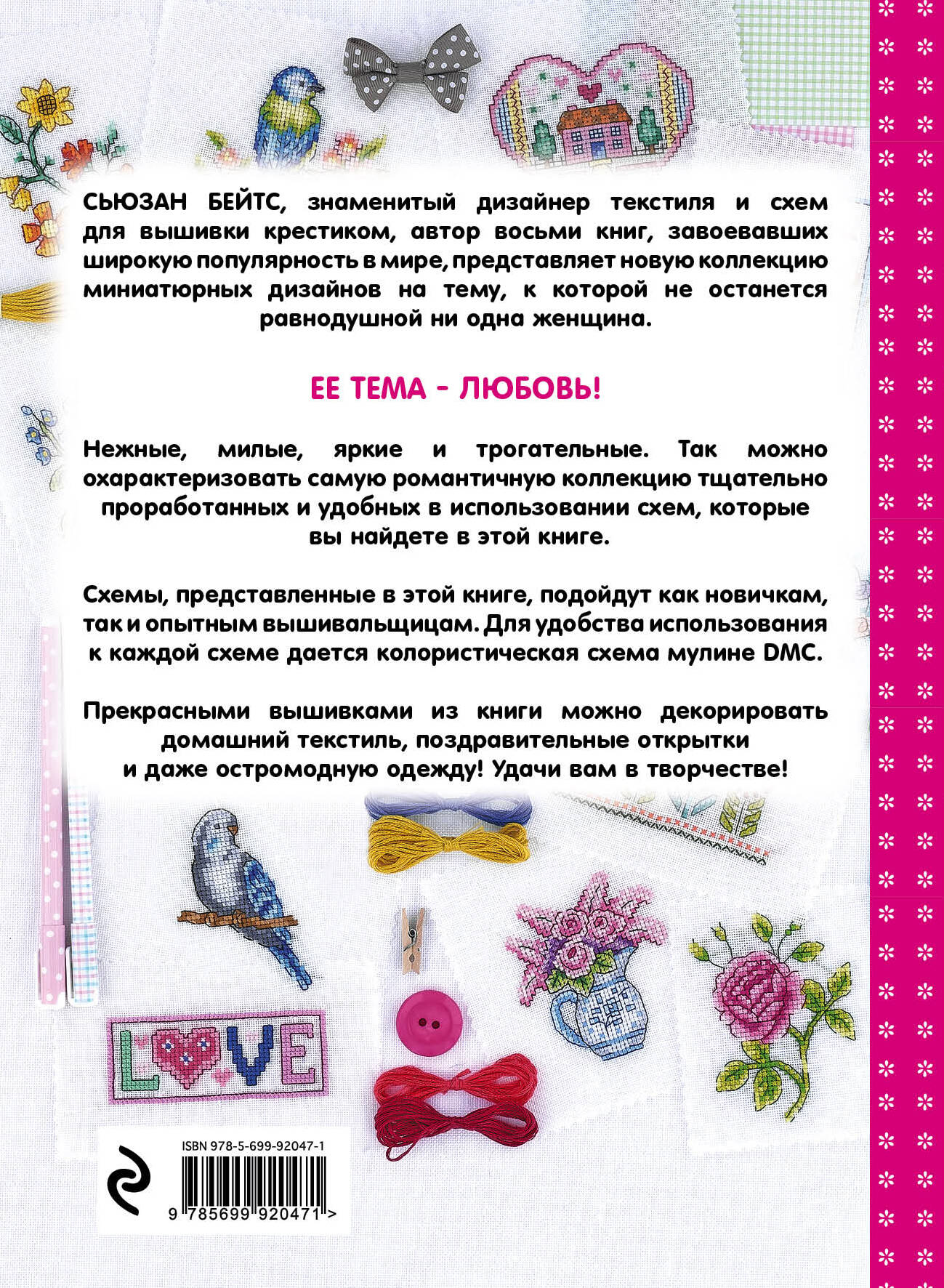 Новая коллекция дизайнов и схем от известного дизайнера Сьюзен Бейтс - сборник красочных цветочных и романтичных мини-мотивовв для вышивки крестиком - самого популярного вида рукодолия на сегодняшний день! Каждый мотив, будь то любимая всеми роза, нежные сердечки или яркие птички, снабжен схемой, благодаря которой вы сможете создать потрясающие изделия для себя и в подарок близким людям. Эти яркие узоры можно использовать для украшения скатерти, одежды или даже поздравительной открытки. Здесь вы найдете вдохновение и простор для полета фантазии!| Издательство | ООО "Издательство "Эксмо" |
