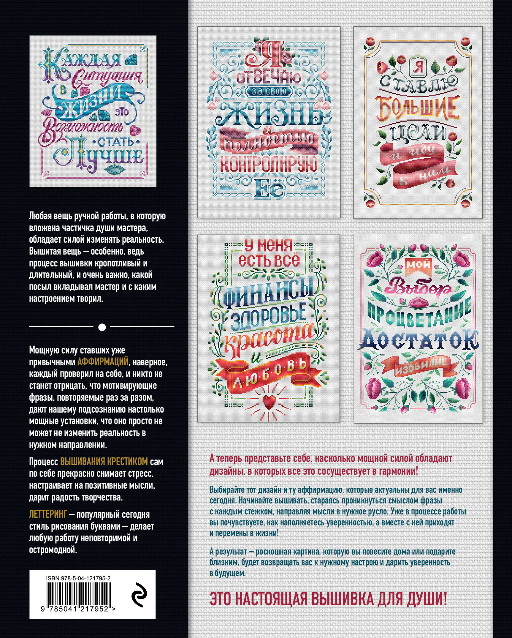 Любая вещь ручной работы, в которую вложена частичка души мастера, обладает силой изменять реальность. Вышитая вещь - особенно, ведь процесс вышивки кропотливый и длительный, и очень важно, какой посыл вкладывал мастер и с каким настроением творил. Эта книга поистине уникальна! В ней соединились три мощных инструмента, которые позволят не только создать потрясающую стильную и красивую вышитую картину, но и по-настоящему изменить свою жизнь к лучшему! В этом нет никакой мистики, судите сами. Никто не станет отрицать, что аффирмации, которые уже многие проверили на себе, дают нашему подсознанию такие установки, что оно просто не может не изменить реальность в нужном направлении, действуя по типу известного психологического приема работы с подсознанием «притворяйся, пока это не станет правдой». Процесс вышивания крестиком прекрасно снимает стресс, настраивает на позитивные мысли, дарит радость творчества и умиротворения, дает возможность побыть наедине с собой. Леттеринг - самый популярный сегодня стиль «рисования буквами» - делает любую работу неповторимой, стильной и очень красивой. А теперь представьте себе, насколько мощной силой обладают дизайны, в которых все это слилось воедино и существует в полной гармонии! Выбирайте тот дизайн и ту аффирмацию, которая актуальна для вас именно сегодня. На удачу и успех или на любовь и семейное счастье, на деньги или на покой в душе. С каждым стежком, ложащимся на канву, суть и смысл фразы все глубже проникают в ваше подсознание. Не сопротивляйтесь, позвольте себе погрузиться в ту реальность, которую вышиваете стежок за стежком, как будто она уже стала явью! Уже в процессе работы вы почувствуете, как наполняетесь уверенностью, а вместе с ней приходят и перемены в жизни! Роскошная картина, которую вы повесите дома или подарите близким, будет возвращать вас к нужным мыслям и дарить уверенность в будущем. Или станет уникальным подарком, который непременно оценят. Яркая, прекрасная женщина, в жизни которой царят гармония и благосостояние, творчество и самореализация! Все это вы! Стоит только в это поверить и немного потрудиться! Это настоящая вышивка для души!| Издательство | ООО "Издательство "Эксмо" |