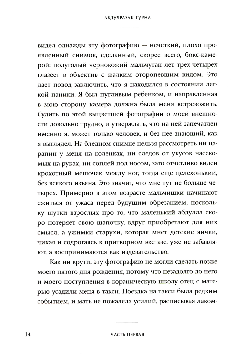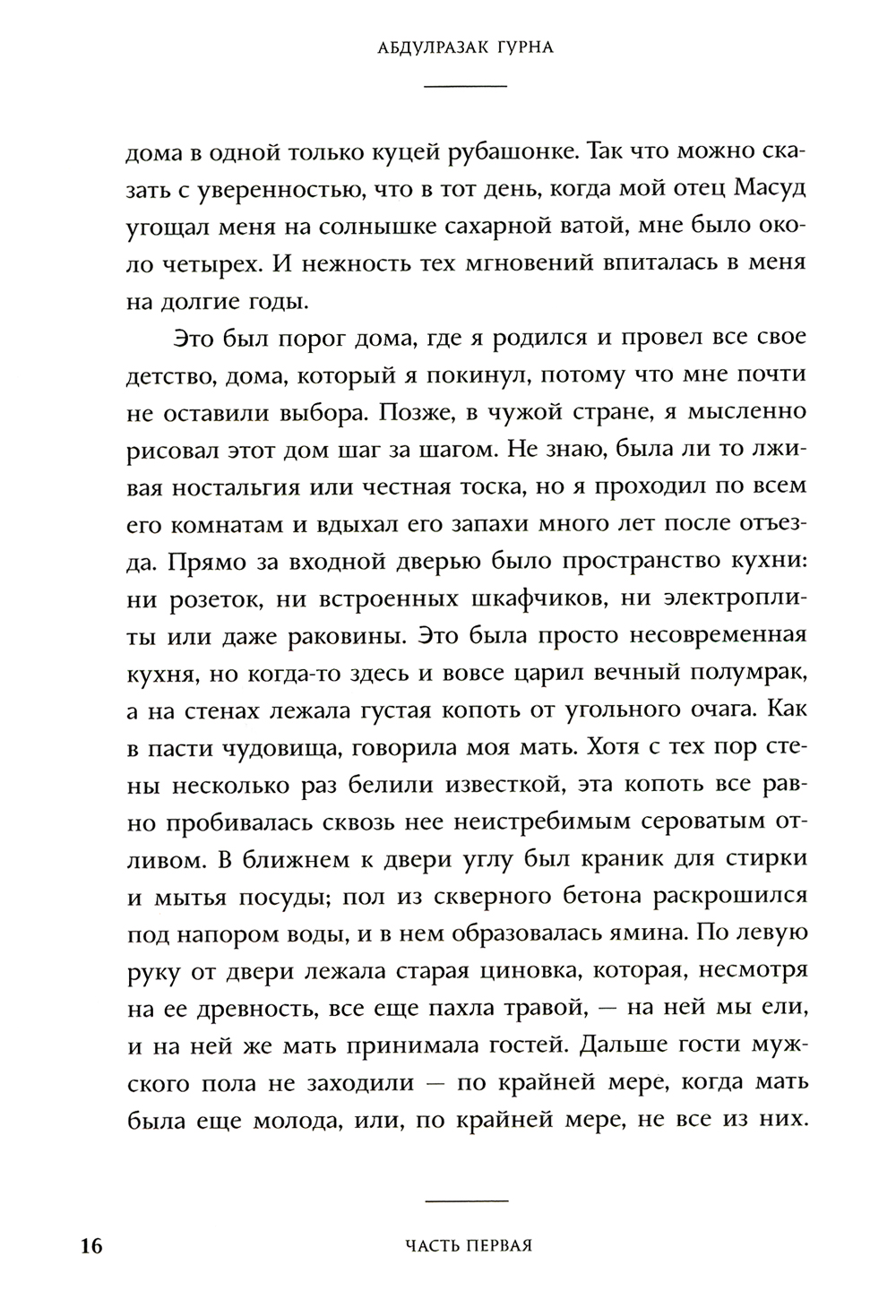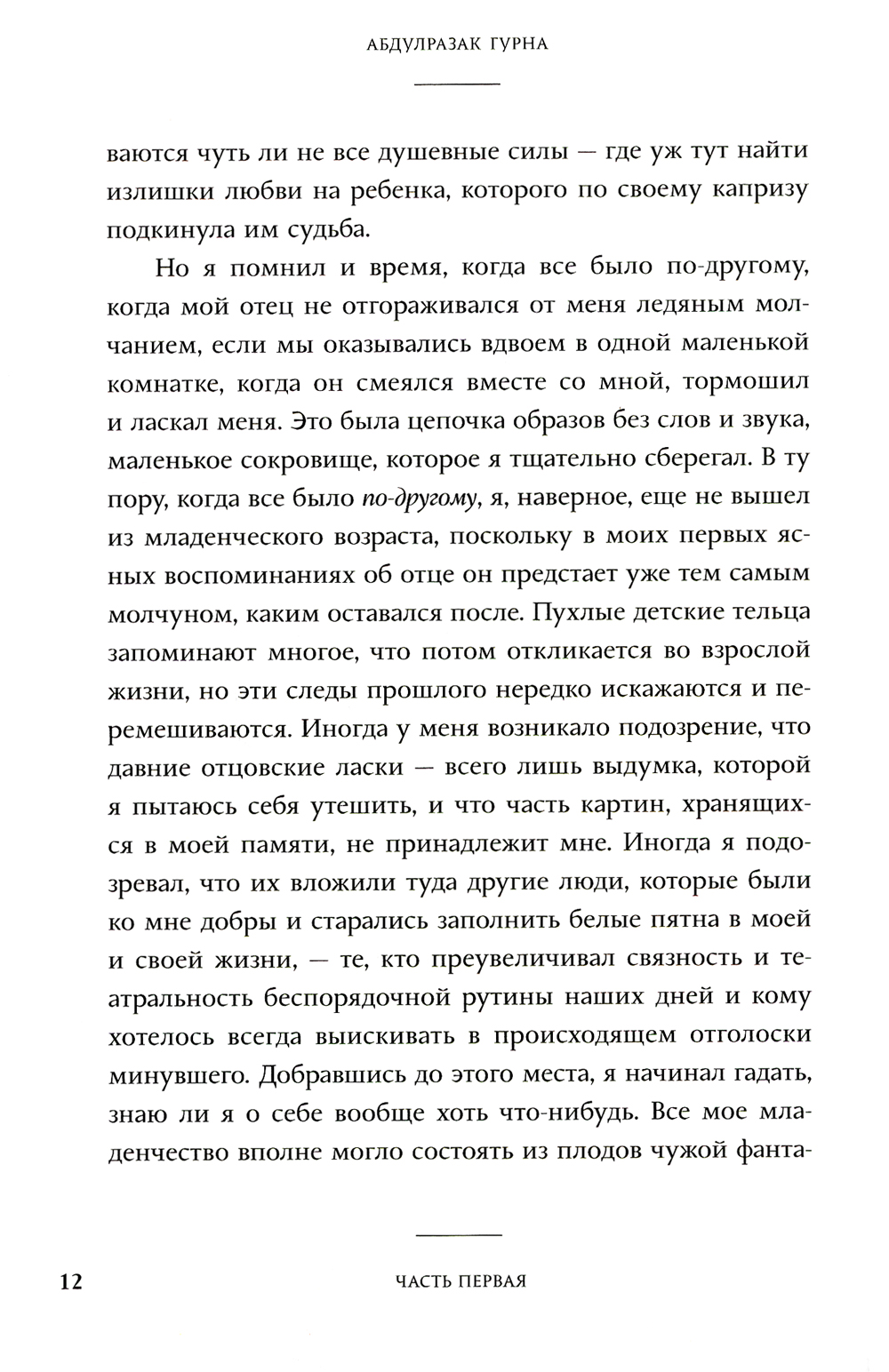 1970-е годы, Занзибар забывает о недавнем конфликте, начинается время перемен. Отец Салима ушел из семьи и отгородился от сына ледяным молчанием. Его мать начала видеться с другим мужчиной и родила дочь. Тишина породила ощущение обмана, а незаданные вопросы остались без ответов. С грузом семейных тайн, болью отвержения и надеждой увидеть большой мир Салим едет в Лондон, чтобы получить образование и вернуть долг, о котором он еще не знает. Новый роман нобелевского лауреата по литературе - впервые на русском языке.