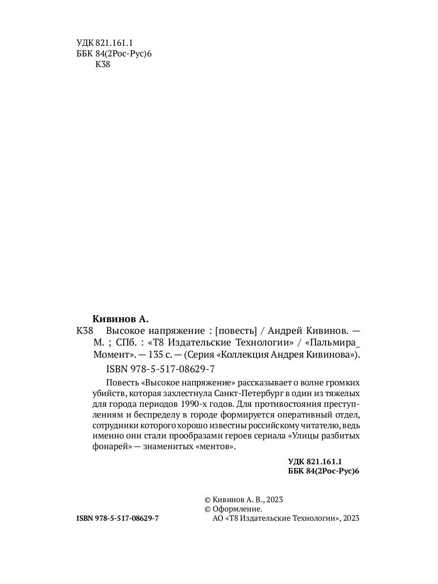 Андрей Кивинов - российский писатель, создатель героев и сюжетов, на долгие годы сформировавших образ сотрудников полиции в постсоветской России. Сериалы "Улицы разбитых фонарей" и "Убойная сила" основаны на романах Андрея Кивинова, а сам писатель в 1990-е годы занимал должность начальника отдела по раскрытию умышленных убийств в Санкт-Петербурге. Сегодня - подполковник милиции в отставке, писатель и сценарист. "Высокое напряжение" рассказывает о волне громких убийств, которая захлестнула Санкт-Петербург в один из тяжелых для города периодов 1990-х годов. Для противостояния преступлениям и беспределу в городе формируется оперативный отдел, сотрудники которого хорошо известны российскому читателю, ведь именно они стали прообразами героев сериала "Улицы разбитых фонарей" - знаменитых "ментов".| Издательство | Т8 RUGRAM |