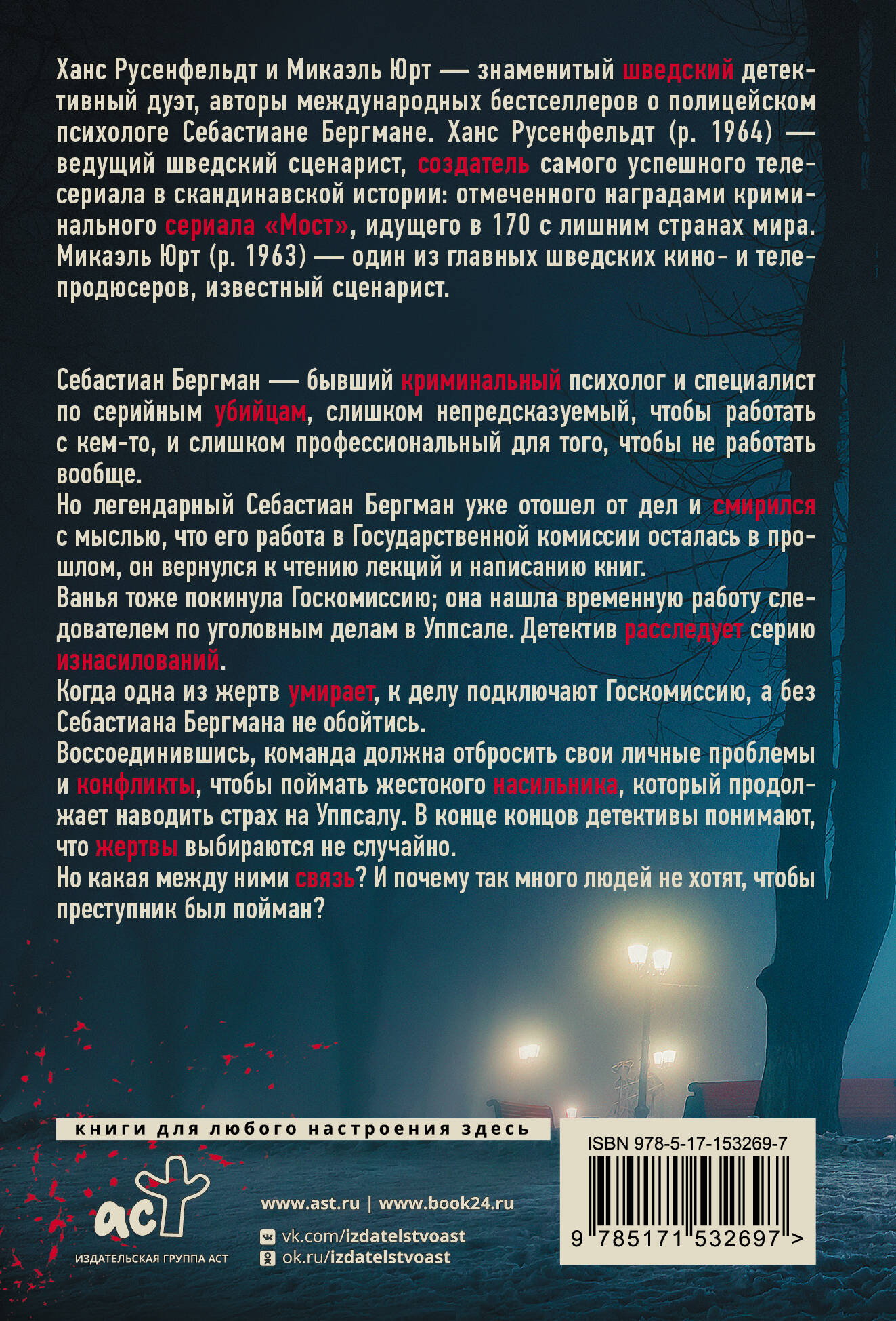 Себастиан Бергман - бывший криминальный психолог и специалист по серийным убийцам, слишком непредсказуемый, чтобы работать с кем-то, и слишком профессиональный для того, чтобы не работать вообще. Но легендарный Себастиан Бергман уже отошел от дел и смирился с мыслью, что его работа в Государственной комиссии осталась в прошлом, он вернулся к чтению лекций и написанию книг. Ванья тоже покинула Госкомиссию; она нашла временную работу следователем по уголовным делам в Уппсале. Детектив расследует серию изнасилований. Когда одна из жертв умирает, к делу подключают Госкомиссию, а без Себастиана Бергмана не обойтись. Воссоединившись, команда должна отбросить свои личные проблемы и конфликты, чтобы поймать жестокого насильника, который продолжает наводить страх на Уппсалу. В конце концов детективы понимают, что жертвы выбираются не случайно. Но какая между ними связь? И почему так много людей не хотят, чтобы преступник был пойман?| Издательство | ИЗДАТЕЛЬСТВО "АСТ" |