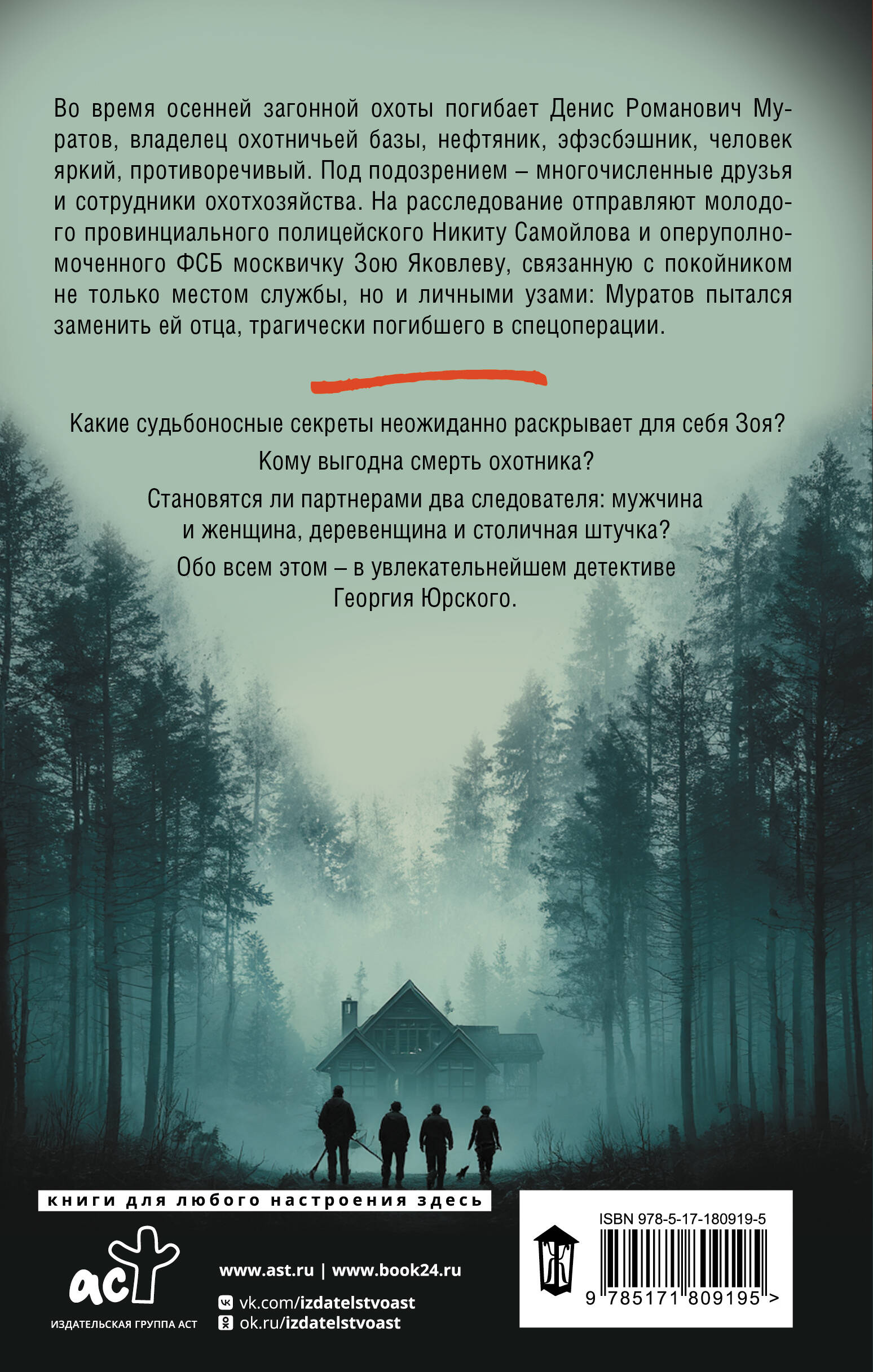 Во время осенней загонной охоты погибает Денис Романович Муратов, владелец охотничьей базы, нефтяник, эфэсбэшник, человек яркий, противоречивый. Под подозрением - многочисленные друзья и сотрудники охотхозяйства. На расследование отправляют молодого провинциального полицейского Никиту Самойлова и оперуполномоченного ФСБ москвичку Зою Яковлеву, связанную с покойником не только местом службы, но и личными узами: Муратов пытался заменить ей отца, трагически погибшего в спецоперации. Какие судьбоносные секреты неожиданно раскрывает для себя Зоя? Кому выгодна смерть охотника? Становятся ли партнерами два следователя: мужчина и женщина, деревенщина и столичная штучка? Обо всем этом - в увлекательнейшем детективе Георгия Юрского.| Издательство | Издательство "АСТ" |