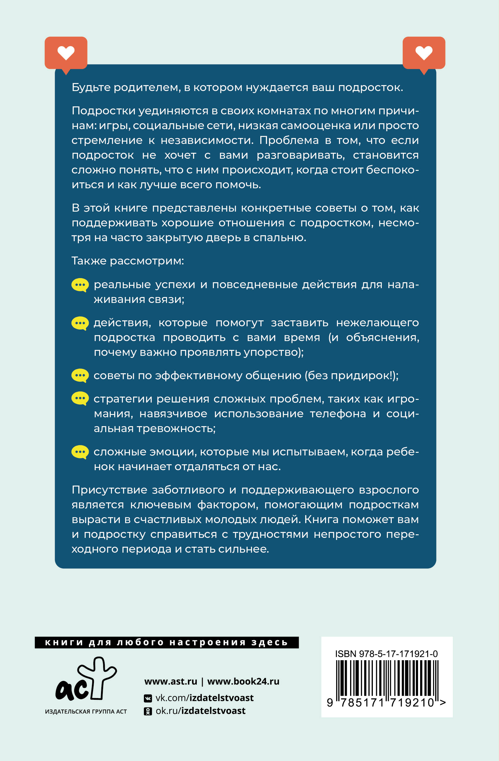 Будьте родителем, в котором нуждается ваш подросток. Подростки уединяются в своих комнатах по многим причинам: игры, социальные сети, низкая самооценка или просто стремление к независимости. Проблема в том, что если подросток не хочет с вами разговаривать, становится сложно понять, что с ним происходит, когда стоит беспокоиться и как лучше всего помочь. В этой книге представлены конкретные советы о том, как поддерживать хорошие отношения с подростком, несмотря на часто закрытую дверь в спальню. Также рассмотрим: - реальные успехи и повседневные действия для налаживания связи; - действия, которые помогут заставить нежелающего подростка проводить с вами время (и объяснения, почему важно проявлять упорство); - советы по эффективному общению (без придирок!); - стратегии решения сложных проблем, таких как игромания, навязчивое использование телефона и социальная тревожность; - сложные эмоции, которые мы испытываем, когда ребенок начинает отдаляться нас. Присутствие заботливого и поддерживающего взрослого является самым ключевым фактором, помогающим подросткам вырасти в счастливых молодых людей. Книга поможет вам и подростку справиться с трудностями непростого переходного периода и стать сильнее.| Издательство | Издательство "АСТ" |