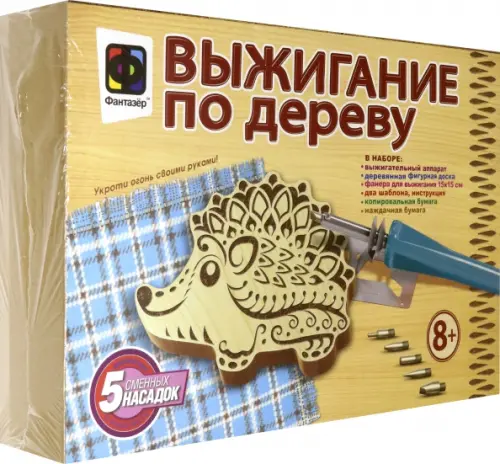В набор входит: выжигательный аппарат со сменными насадками (5 штук), фигурная деревянная доска, фанера 15х15 см для выжигания, наждачная и копировальная бумага, шаблон, инструкция.